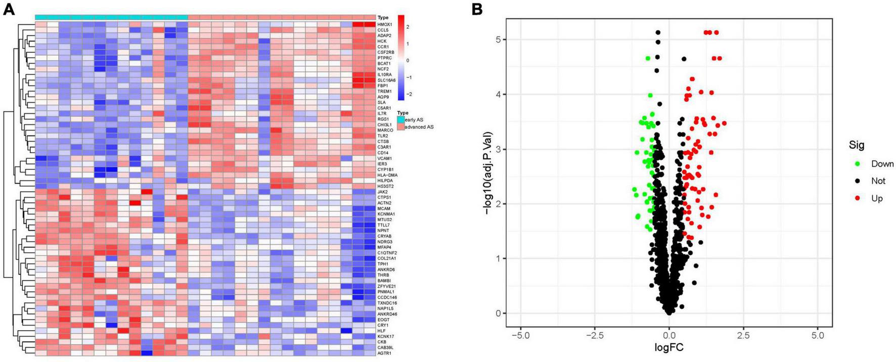 Analysis of differential genes. (A) Heat map of differential genes. (B) Volcano map of differential genes. (S1 represents early AS, S2 represents advanced AS).