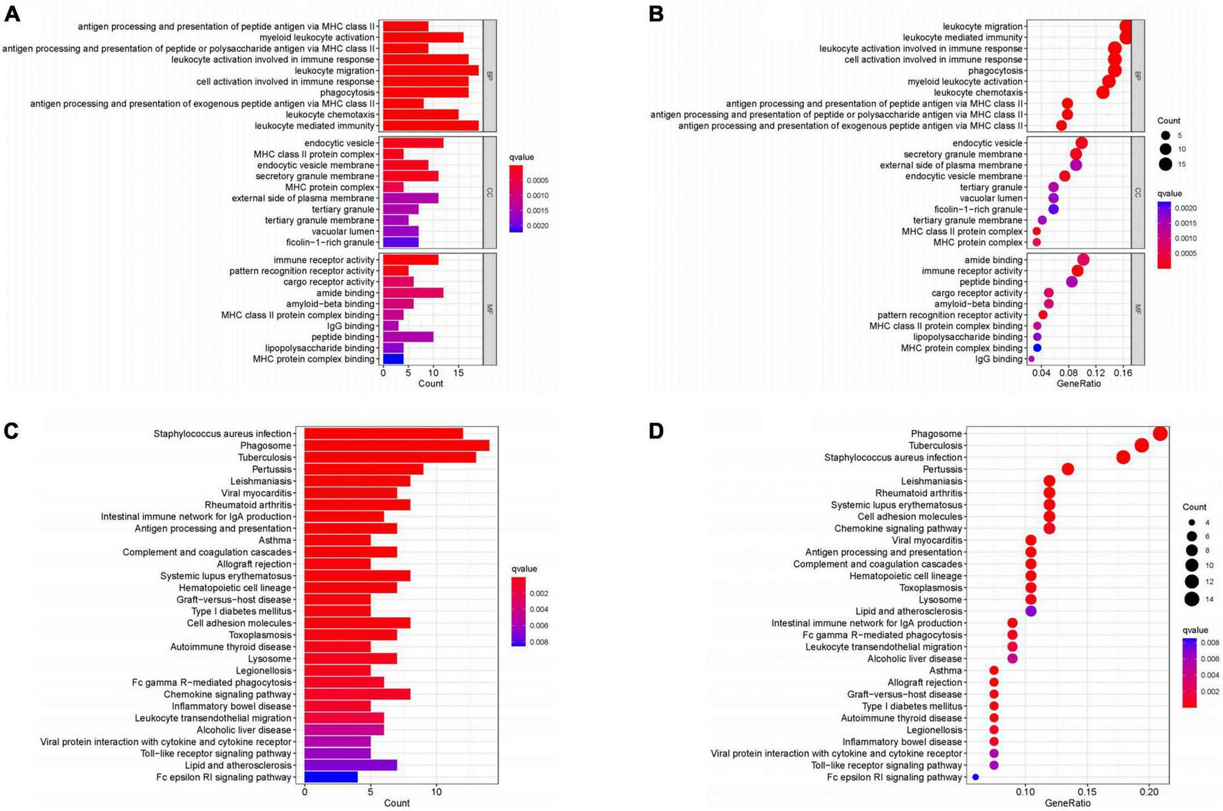 Enrichment analysis. (A,B) GO enrichment analysis. (C,D) KEGG enrichment analysis. (Histogram, the darker the color of the bar the more significant the enrichment. Bubble plot, the larger the bubble the darker the color the more significant the enrichment).