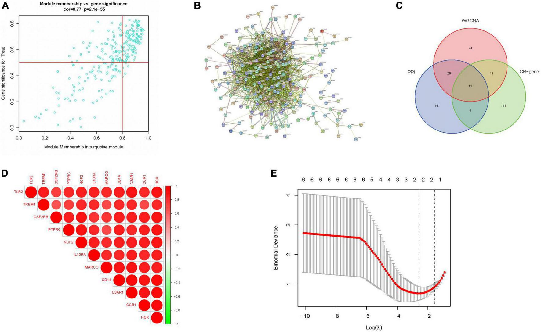 Key gene screening. (A) Meturquoise module gene scatter plot. (B) PPI of meturquoise module genes. (C) Veen plot of intersecting genes. (D) Correlation heat map of intersecting genes. (E) Lasso analysis. (CR-gene represents circadian regulated differential genes).