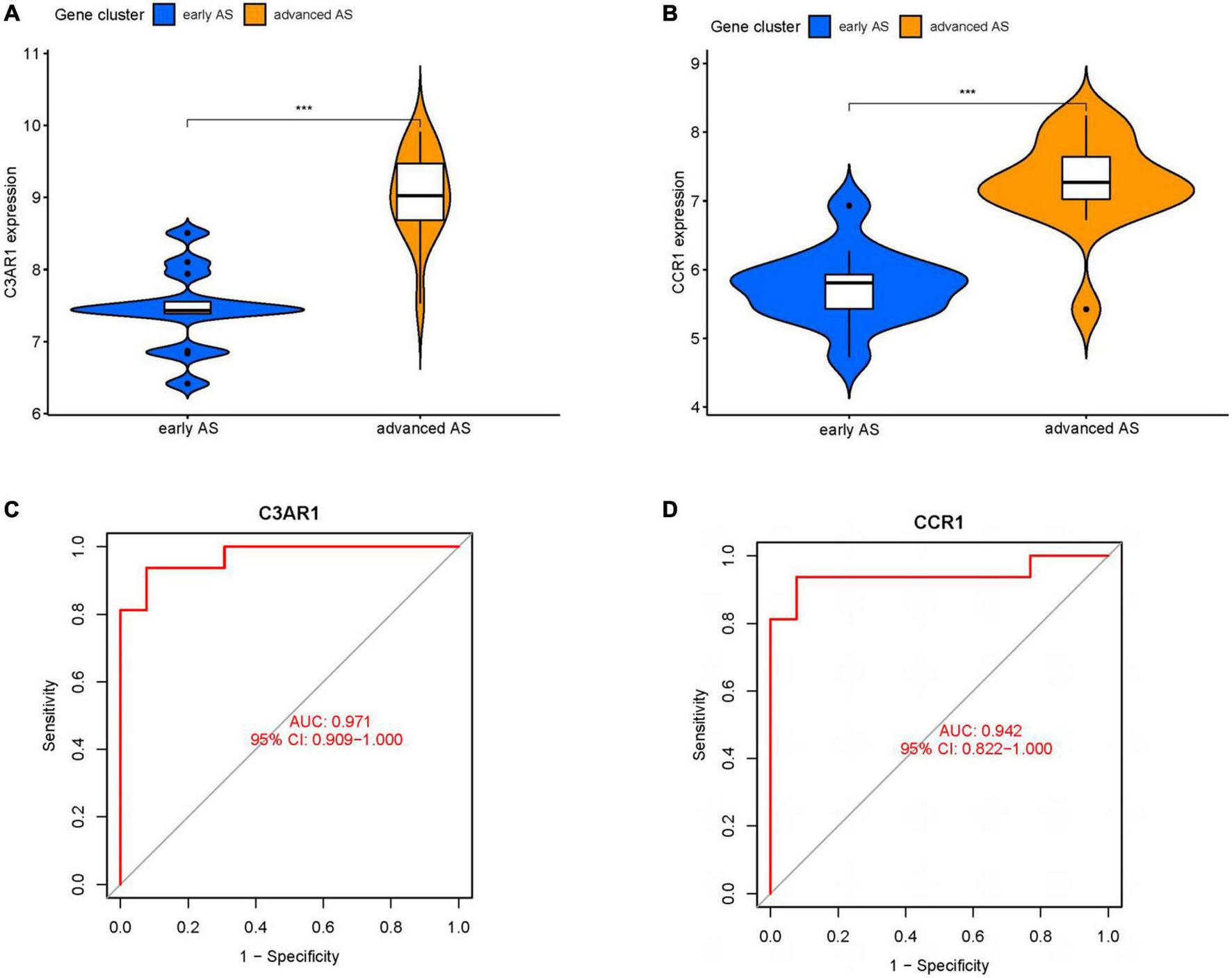 Key gene analysis. (A) Violin plot of expression difference of C3AR1 in early and advanced AS. (B) Violin plot of expression difference of CCR1 in early and advanced AS. (C) ROC curve of C3AR1 distinguishing early and advanced AS. (D) ROC curve of CCR1 distinguishing early and advanced AS. (**P < 0.01, ***P < 0.001).