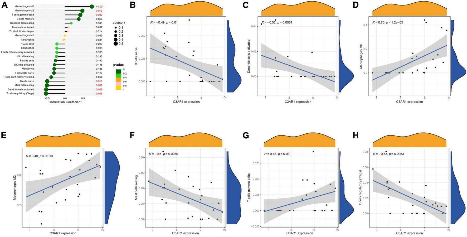 Immune correlation analysis of C3AR1. (A) Immune correlation lollipop chart. (B–H) Immune cells and C3AR1 correlation scatter plot.