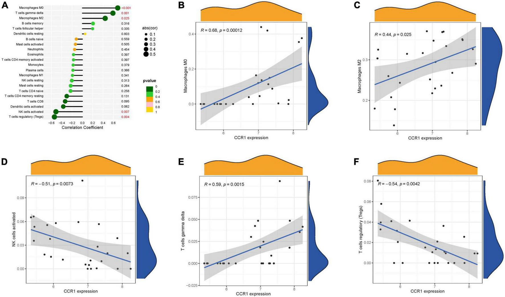 Immune correlation analysis of CCR1. (A) Immune correlation lollipop chart. (B–F) Immune cells and CCR1 correlation scatter plot.