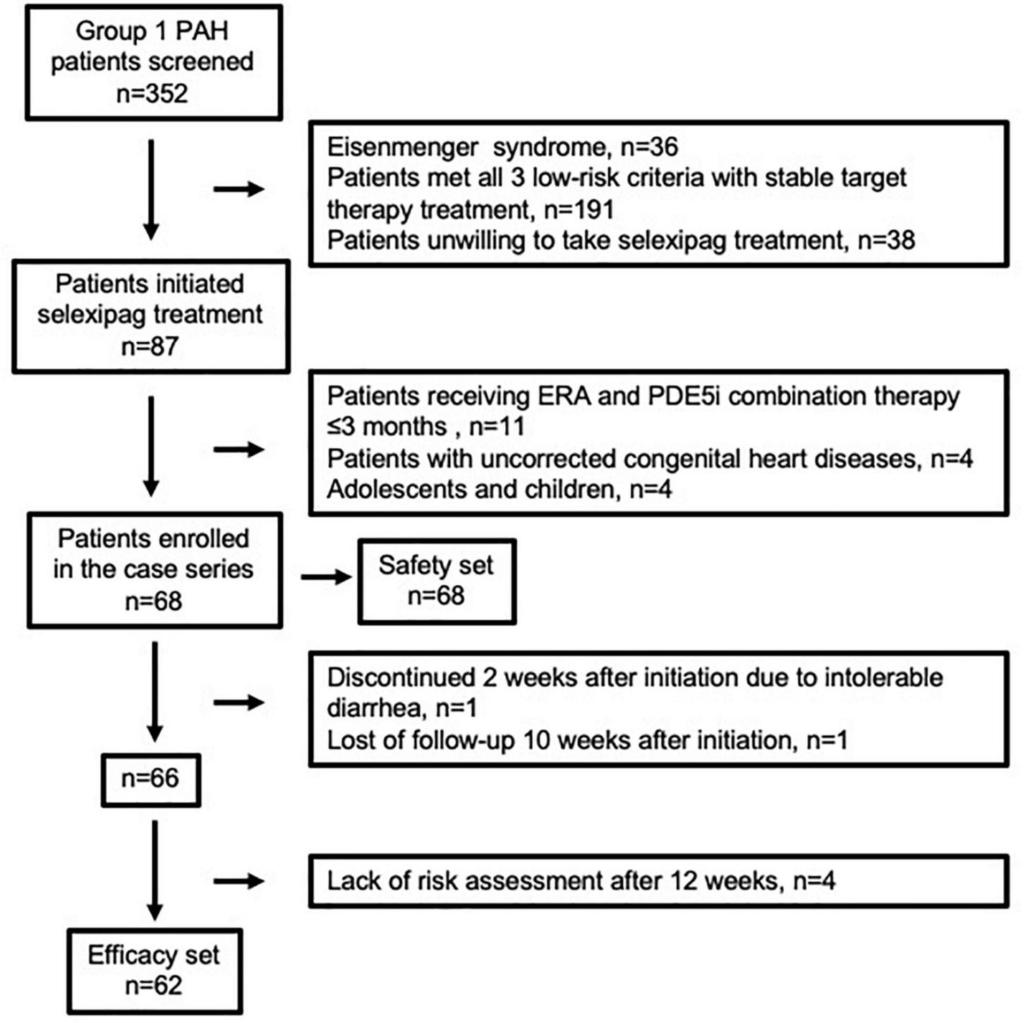This single center, retrospective uncontrolled study was carried out in Qilu Hospital of Shandong University in northern China. Group 1 PAH patients diagnosed by right heart catheterization, including idiopathic PAH (IPAH), heritable PAH (HPAH), post-operative PAH associated with congenital heart disease (post-operative CHD-PAH), PAH associated with connective tissue diseases (CTD-PAH), and PAH associated with HIV infection were screened. Those who has Eisenmenger syndrome, met all three low-risk criteria with stable target therapy treatment or unwilling to take selexipag treatment were excluded from selexipag initiation. Those who began triple treatment which included selexipag, ERAs and PDE5is from 1 February 2020 to 31 August 2021, were recruited for the study. For sequential addition of selexipag to ERA and PDE5i, only patients who had already received at least 3 months stable treatment with ERA and PDE5i were included. Adolescents, children and patients with PAH related to uncorrected congenital heart disease (having treat-to-repair therapy) who took selexipag were excluded from the current analysis. The flow chart of enrollment was shown in Figure 1. All patients were recommended to undergo clinical evaluation every 3 months. The cutoff date for follow-up data collection was 31 December 2021. For the analysis, the safety set included all patients (n = 68) taking at least one dose of selexipag, while the efficacy set included patients (n = 62) taking continuous selexipag treatment over 12 weeks and undergoing at least one risk assessment during follow-up. The study was approved by the Institutional Human Ethics Committee of Qilu Hospital (reference number: 2021072) and written informed consent was exempted.