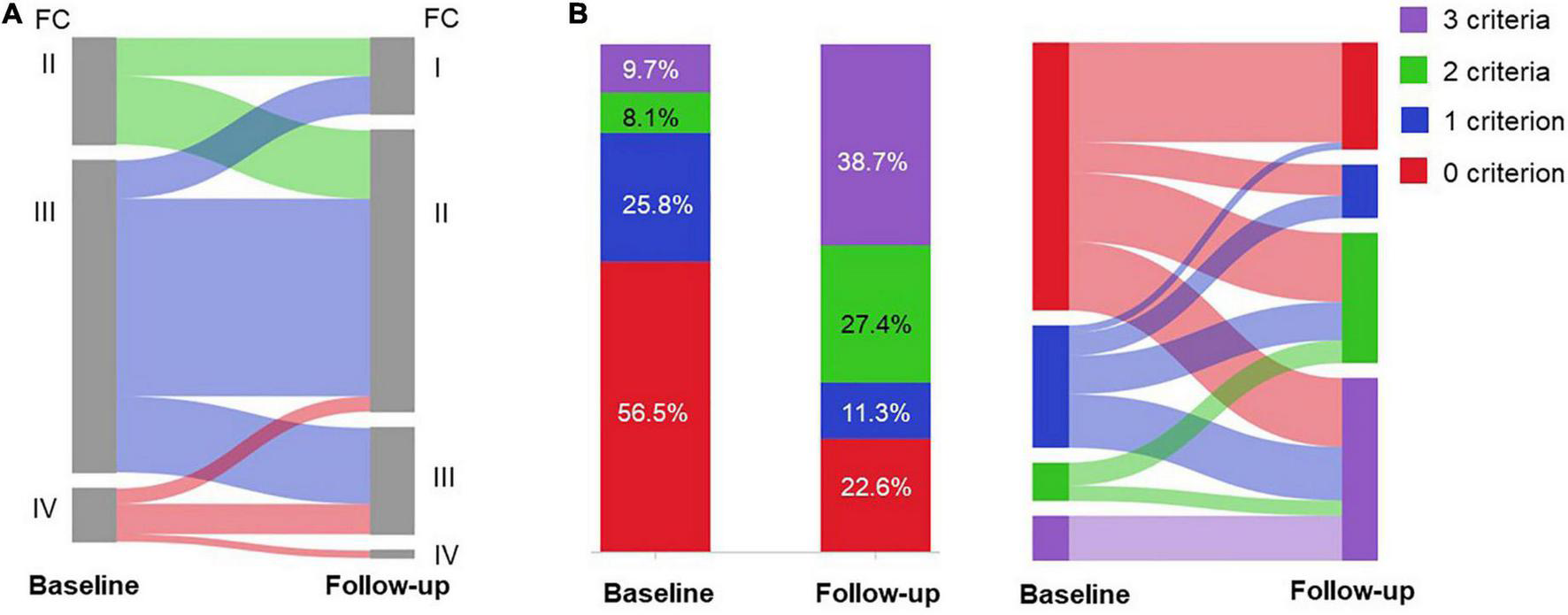 Based on FPHN non-invasive risk assessment, the percentage of patients with all three low-risk criteria increased from 6 (9.7%) to 24 (38.7%), while the proportion of patients with no low-risk criteria decreased from 35 (56.5%) to 14 (22.6%) (p < 0.001; Figure 2B). For those 35 patients with no low-risk criteria at baseline, 22 (62.9%) of patients reached at least one low-risk criterion and 25.7% improved to all three low-risk criteria.