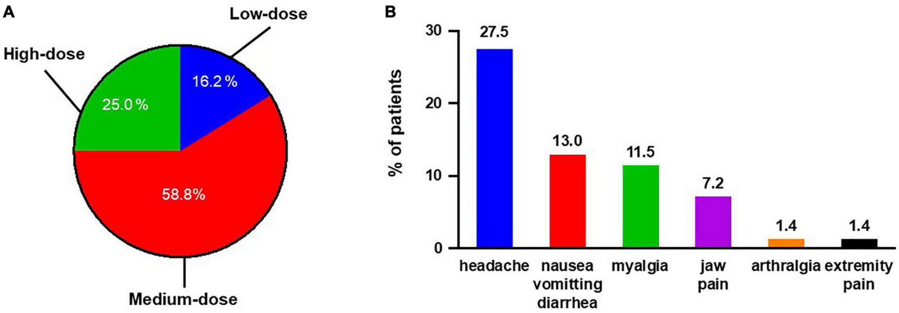 Summary of selexipag usage for all 68 Chinese PAH patients. (A) Maintenance dosage of selexipag in Chinese PAH patients: low-dose, 200–400 μg twice daily; medium-dose, 600–1,000 μg twice daily; and high-dose, 1,200–1,600 μg twice daily. (B) Side effects reported during maintenance period.