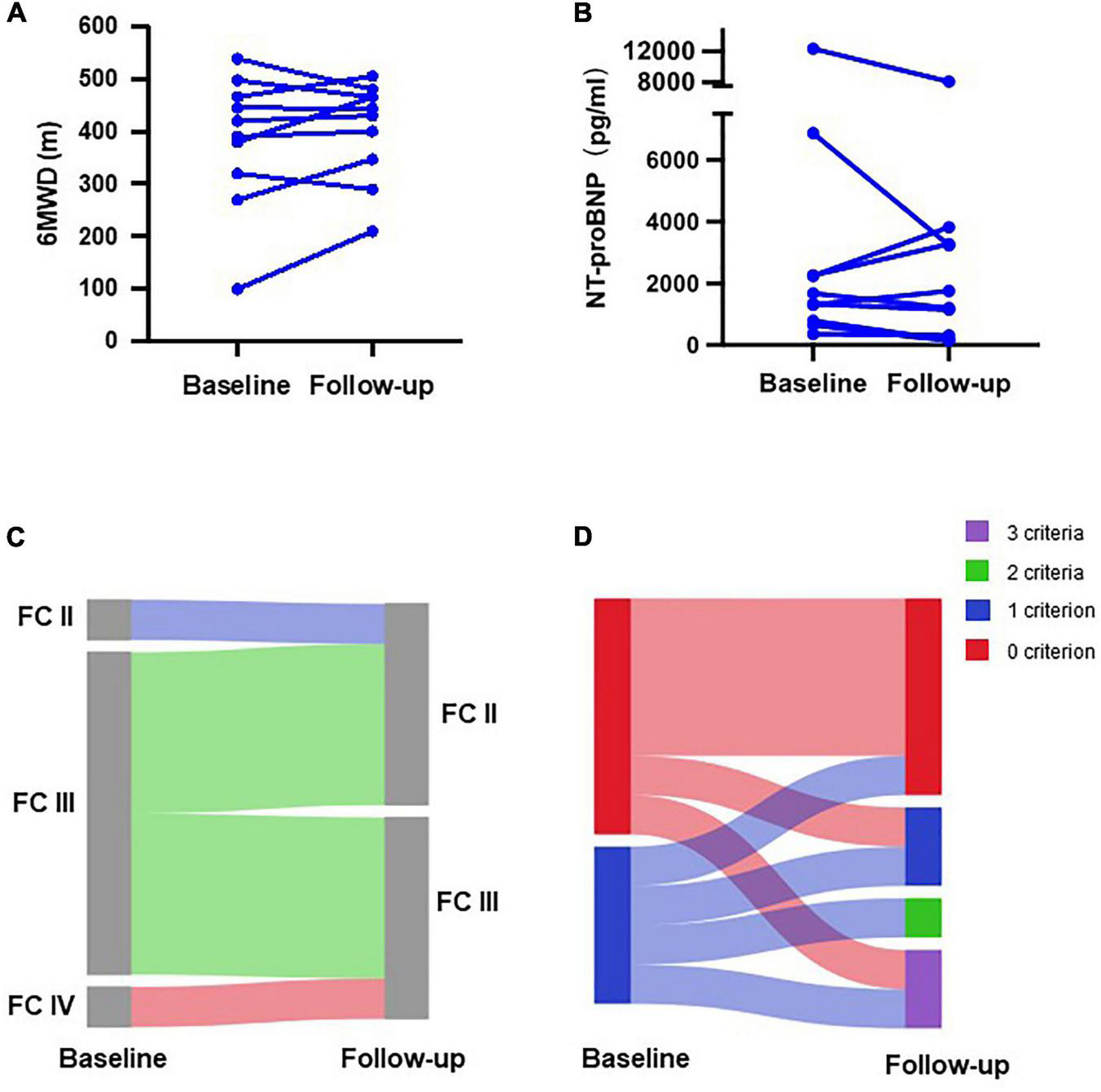 We also separately evaluated patients who transitioned from subcutaneous treprostinil to oral selexipag (n = 10). Treatment with treprostinil was terminated in two patients due to intolerable side effects, and in eight patients who were unwilling to continue due to economic burden. The average time to the last risk assessment was 29 ± 15 weeks. Six-minutes walking distance increased from 383 ± 127 to 404 ± 94 m (Figure 4A), and NT-proBNP levels decreased from 2,987 ± 3,770 to 2,319 ± 2,448 pg/mL (Figure 4B). At baseline, only one patient was diagnosed as WHO FC II, while the other nine patients were diagnosed as WHO FC III/IV. All patients showed improvement in the WHO functional class (Figure 4C). At baseline, six patients exhibited zero low-risk criteria, and four patients exhibited one low-risk criterion. After selexipag treatment, two patients reached all three low-risk criteria, two patients improved to meet more low-risk criteria, and four patients remained stable without PAH-associated hospitalization (Figure 4D). Two patients continued to deteriorate and were hospitalized due to right heart failure 9–39 weeks after transition, respectively.