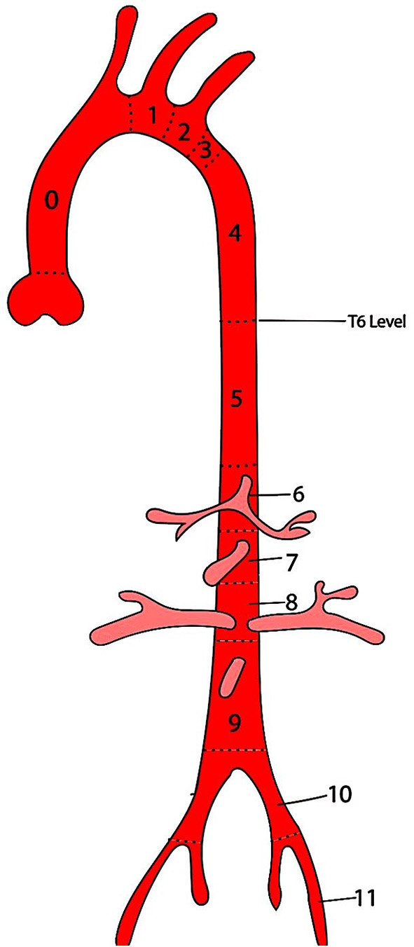 | Type B | T6 level to the celiac axis |