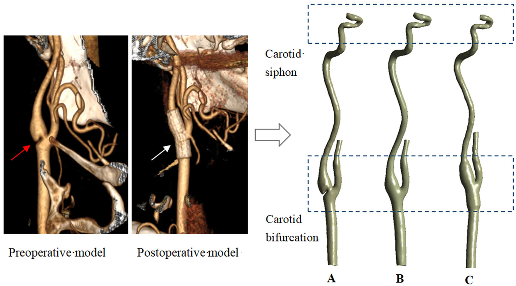 Three models reconstructed from CT data. (A–carotid webs model; B–endarterectomy model; C—stenting model. The red and white arrows point to the web and the stent).