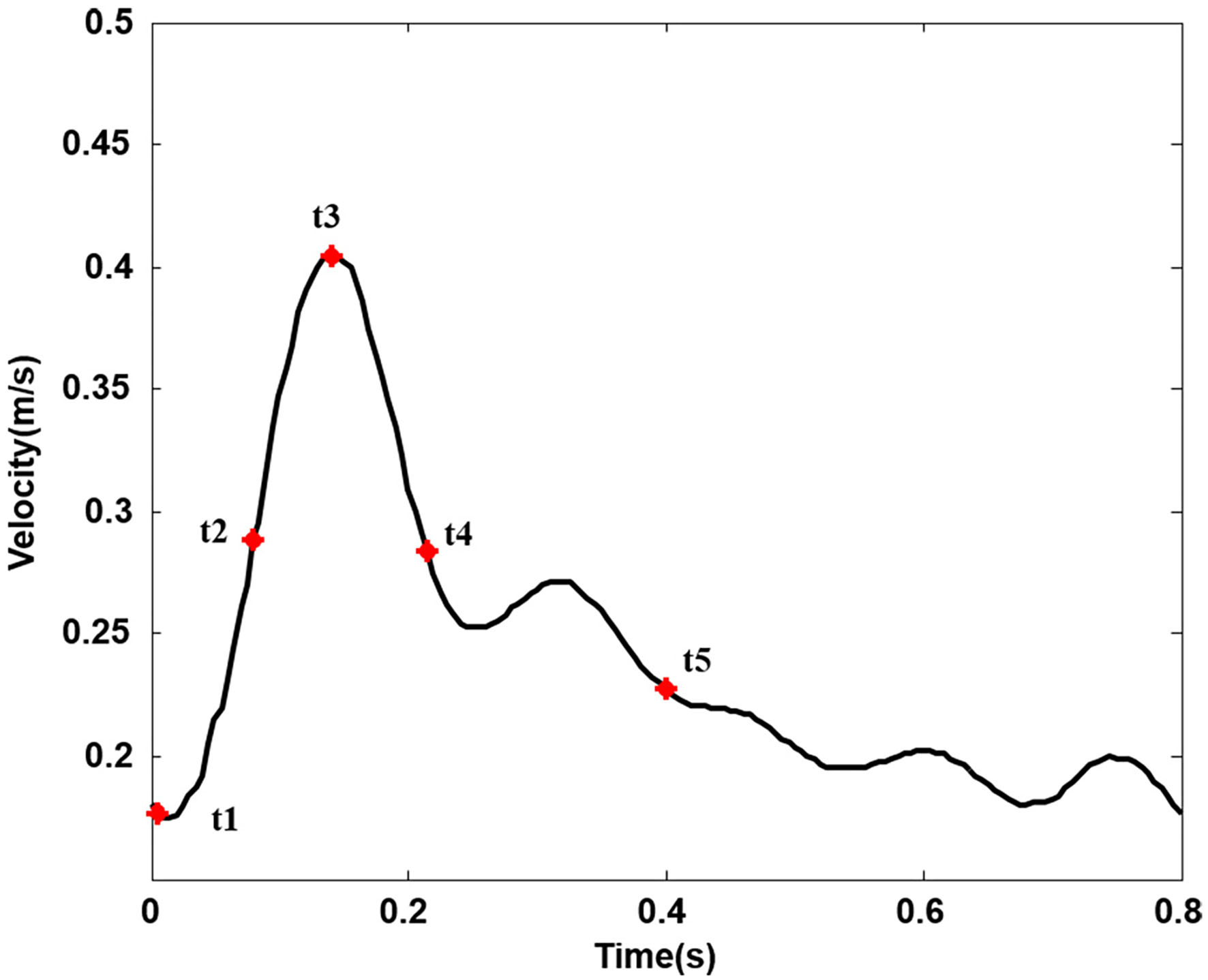 Inlet velocity pulse in the common carotid artery. (Five typical points during one cardiac cycle. t1, t2, t3, t4, and t5, respectively, represent start systole, early systole, peak systole, late systole, and early diastole).