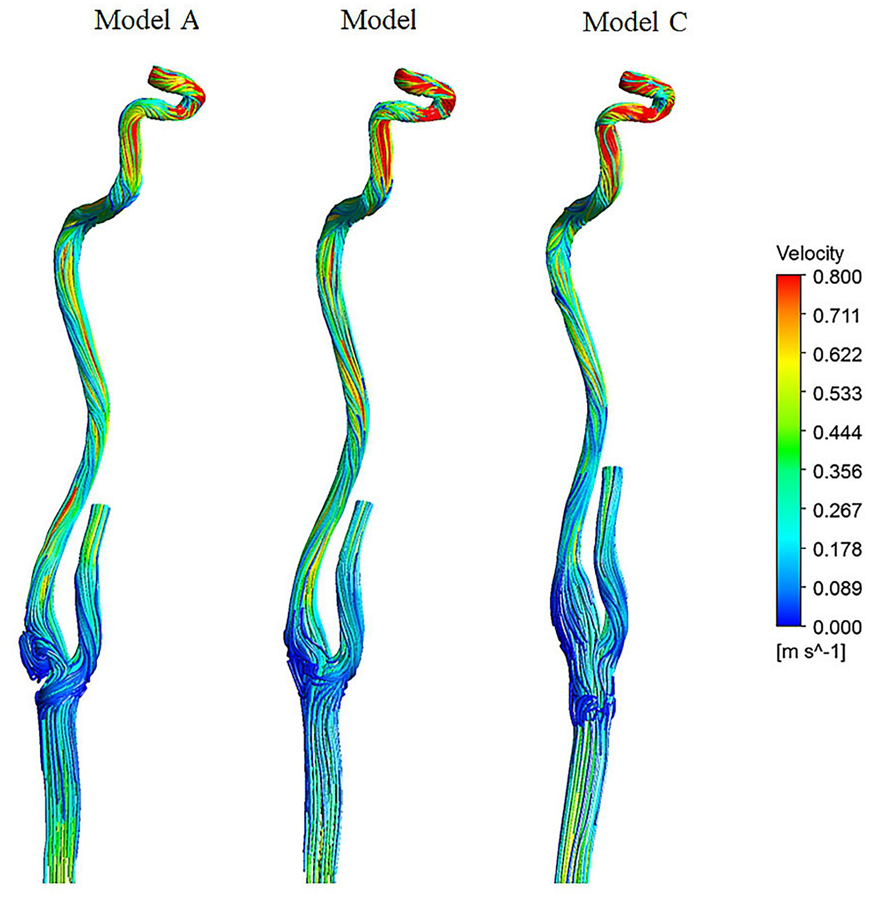 Downstream of the carotid bifurcation, the blood flow in the three models remains stable along the internal carotid arteries until it reaches the carotid siphon.