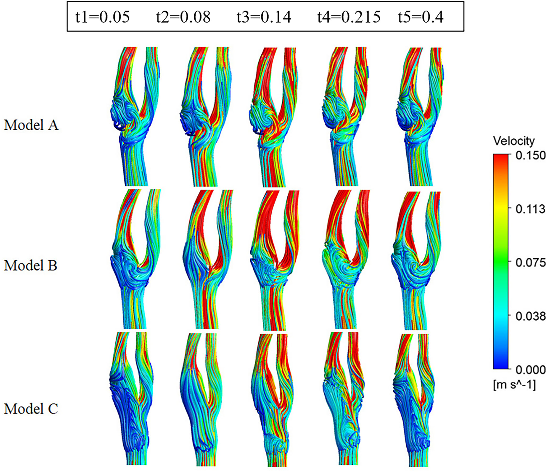 Streamlines colored by the magnitude of velocity at five time points.