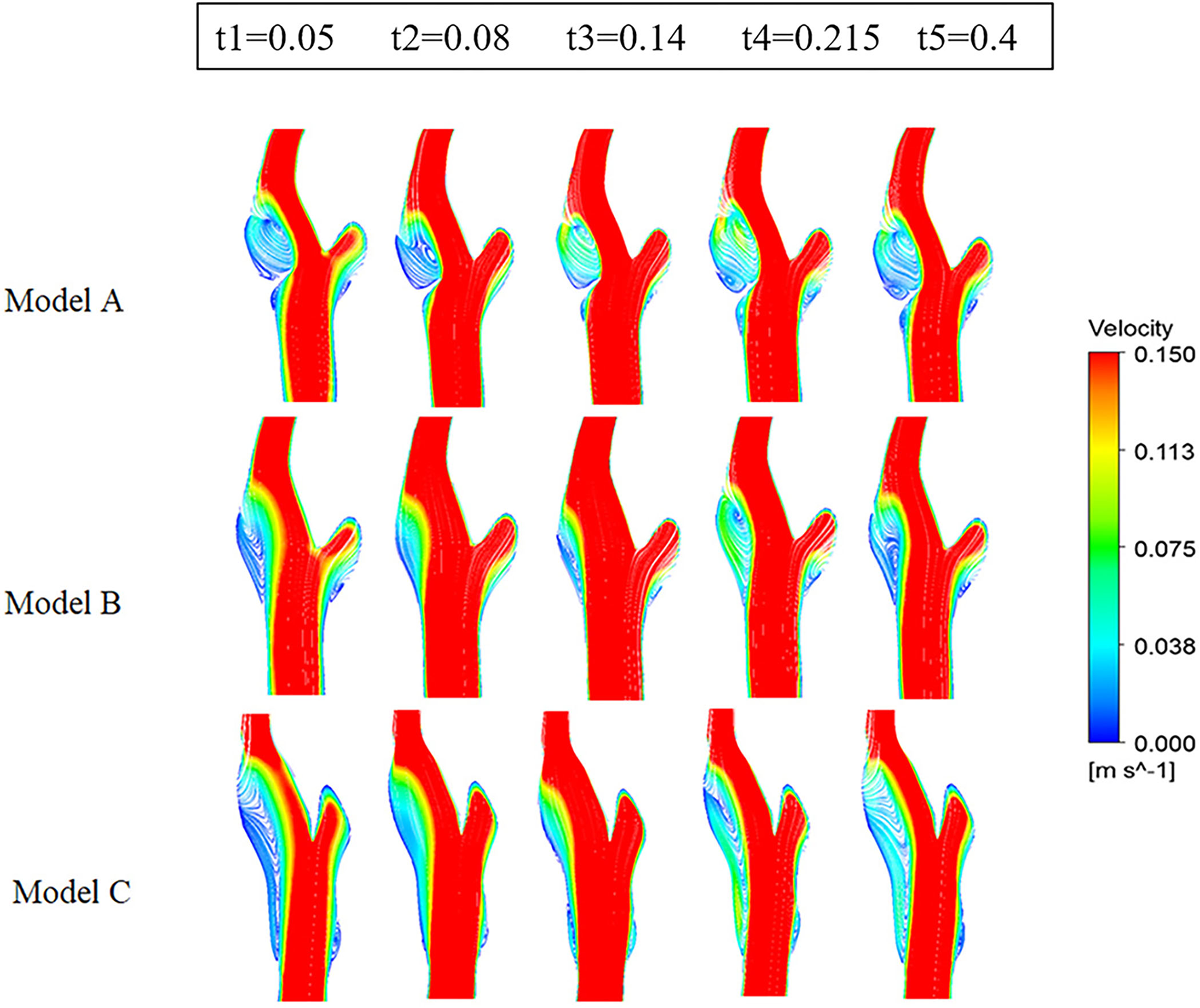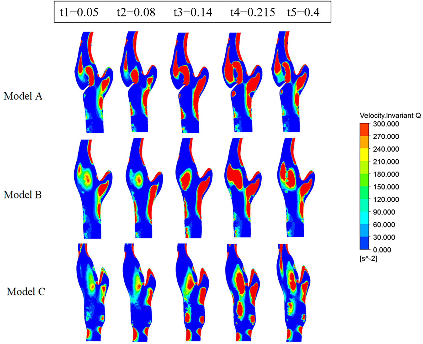 Figure 6 represents the Q-value distribution on the cross sections, which can quantitatively describe the flow vortex in the flow field. High Q zones existed in all three models and along all the heart cycles, due to the bifurcation geometry of the carotid artery. The high Q zones are larger in Model A than in Model B and Model C, especially at the early systolic time points (t1, t2). When comparing Model B and Model C, the high Q zones in Model C are smaller and more dispersed.