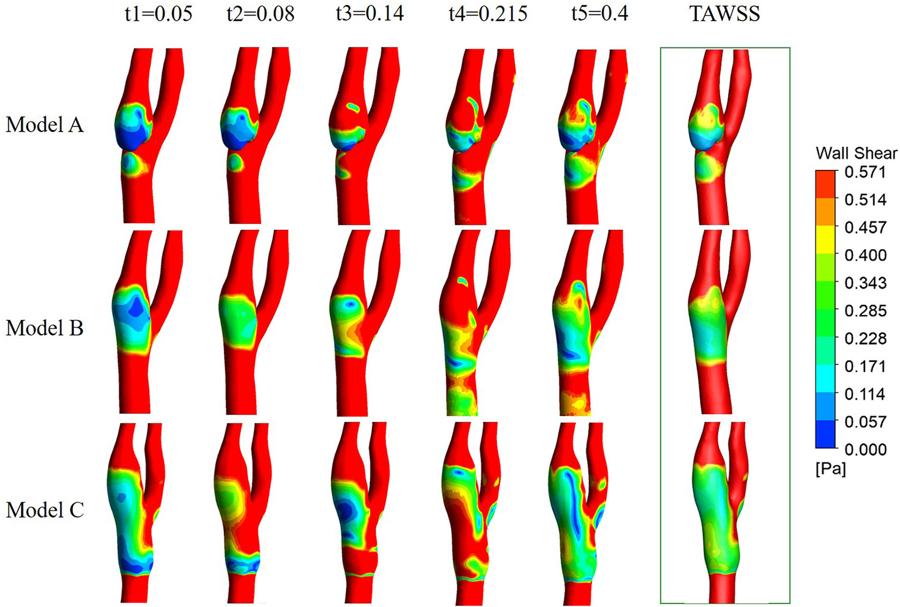 Figure 7 shows the WSS and TAWSS distribution contours of the three models. At the corner zone distal of the web in Model A, the wall shear stress is below 0.4 Pa throughout the cardiac cycle, and TAWSS was lower than 0.2 Pa, which is distinctly lower than in the other two models.