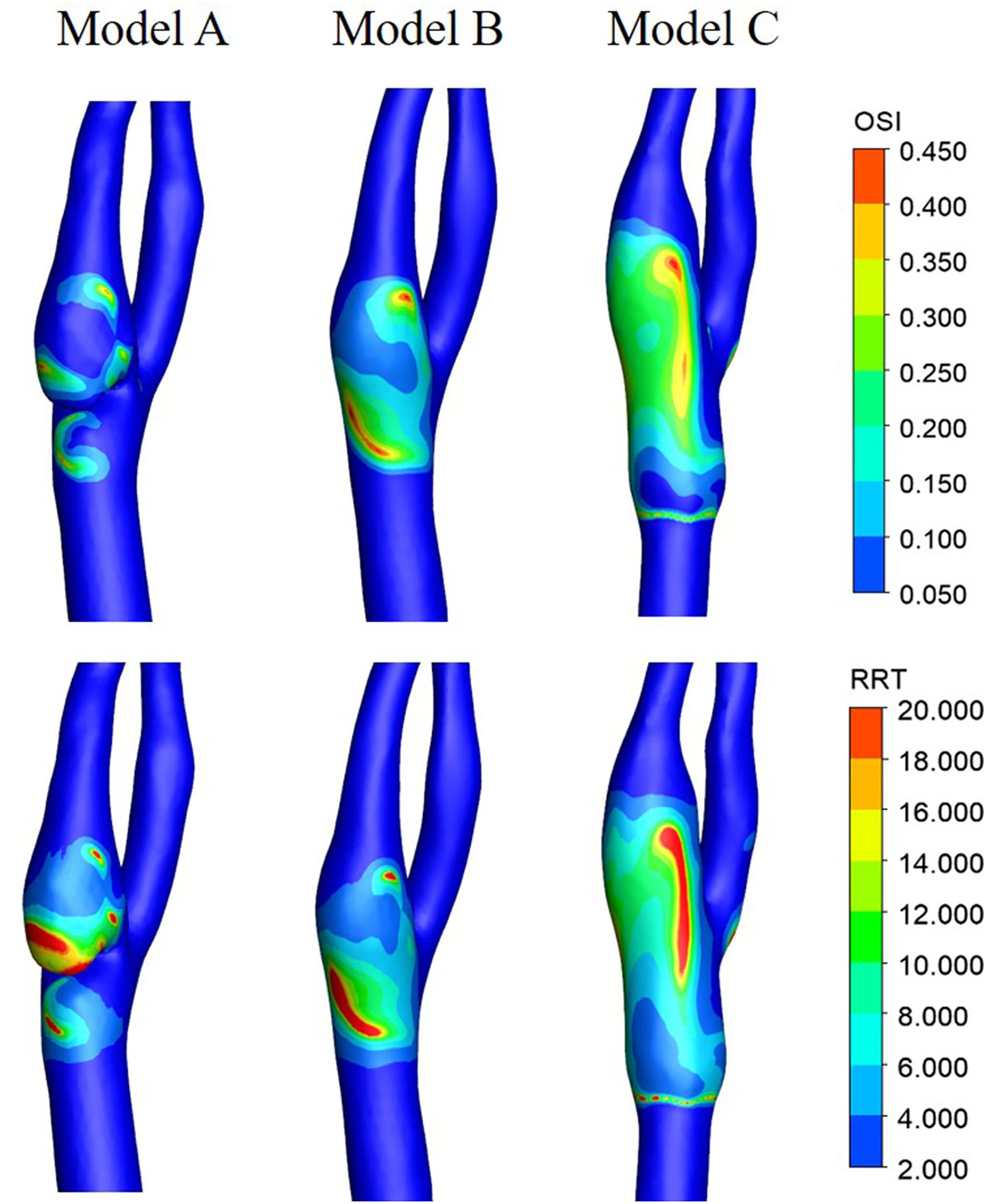 As can be seen from Figure 8, relatively high OSI zones were observed in all three models, with relatively small zones in Model A and large zones in Model C. As the OSI represents the oscillation of WSS direction change, the OSI distribution features revealed that the WSS direction in Model A is relatively stable and in Model C is more unstable. This is probably because the stenting procedure increased the lumen diameter when oversizing the stent. The high values of RRT in Model A mainly concentrate on the corner zone distal to the web, while the distribution in Model B and Model C is relatively dispersed.