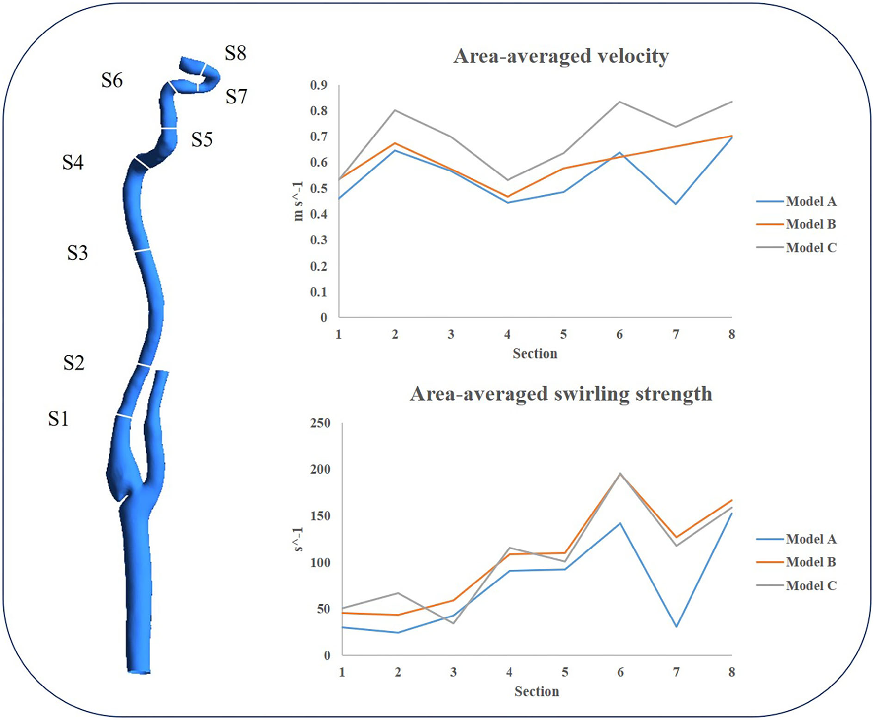 The cross sections are shown on the left; area-averaged velocity and area-averaged swirling strength in eight cross sections are shown on the right at the peak systole.