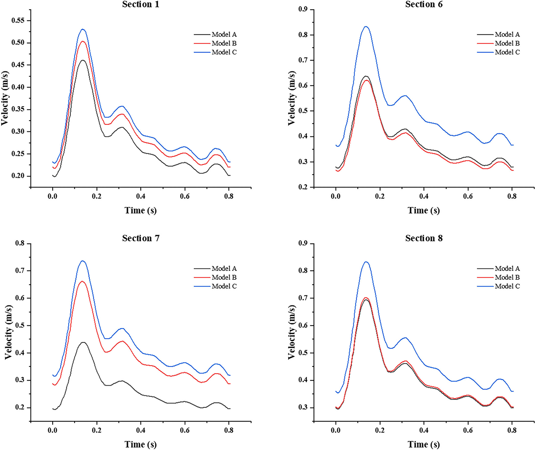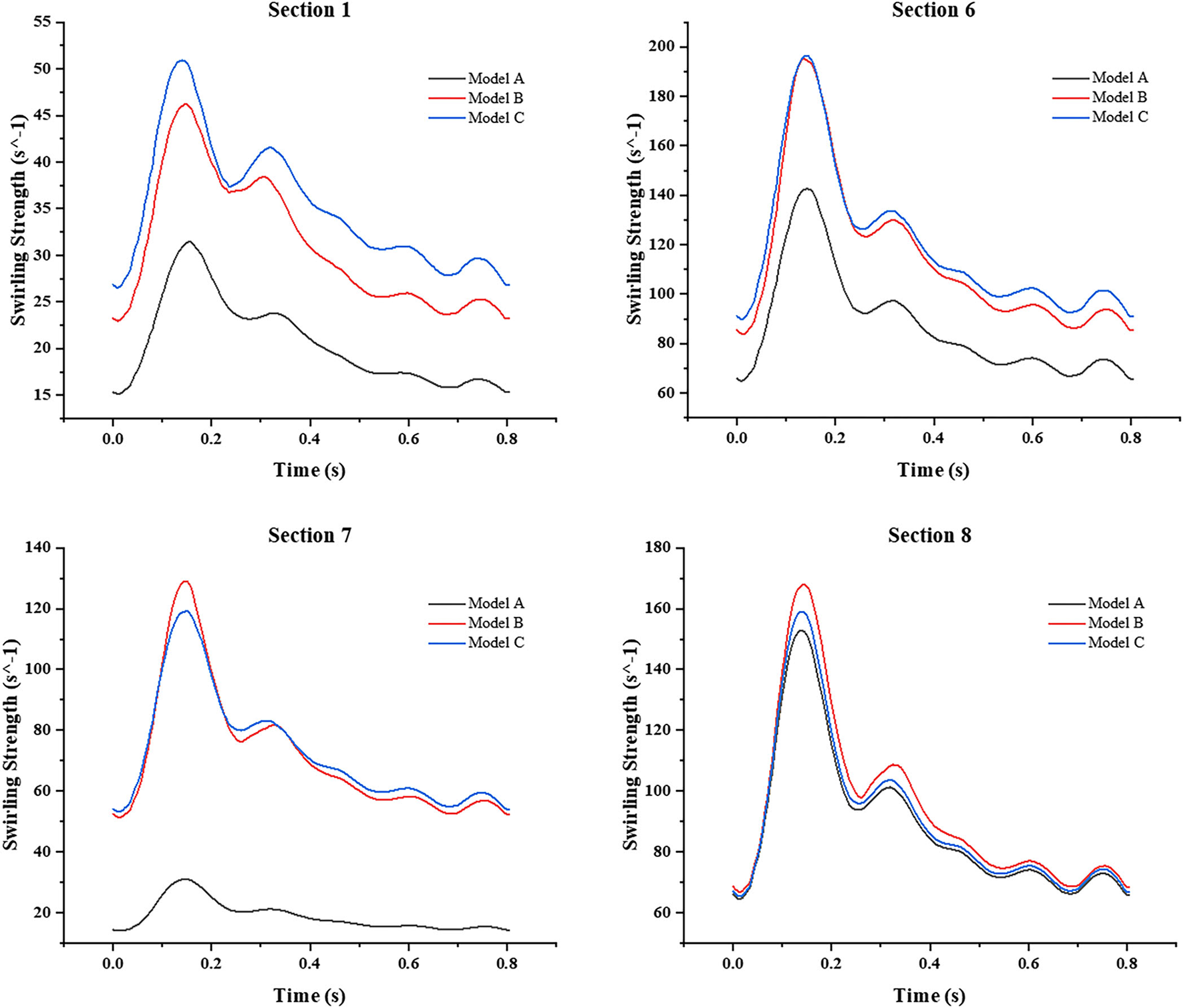 In addition, we also focused on the changes of the area-averaged velocity and area-averaged swirling strength in cross sections of the three models over time in one cycle, as shown in Figures 10, 11. Compared with Model A, the average velocity of Model B and Model C increased, and the increase in Model C was more obvious. In addition, for the averaged-swirling strength, Model B and Model C have a similar degree of increase.