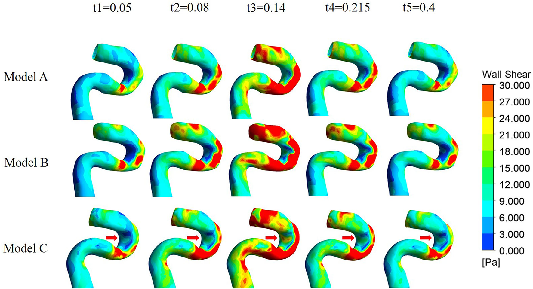 The distributions of WSS at the carotid siphon in the three models are all uneven, being higher on the outer wall and lower on the inner wall. The difference between the three models appears on the inner side of the distal curve of the siphon (arrow in Figure 12). There was no significant difference between Model A and Model B, while Model C had the highest WSS.