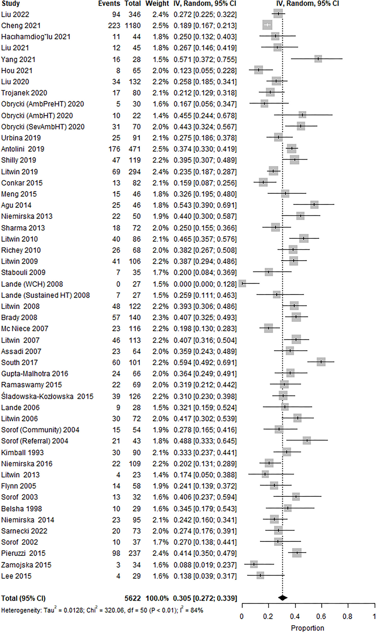 The overall prevalence of LVH was 30.5% (95% CI 27.2 to 33.9; Figure 2), while the heterogeneity was high (I2 = 84%).