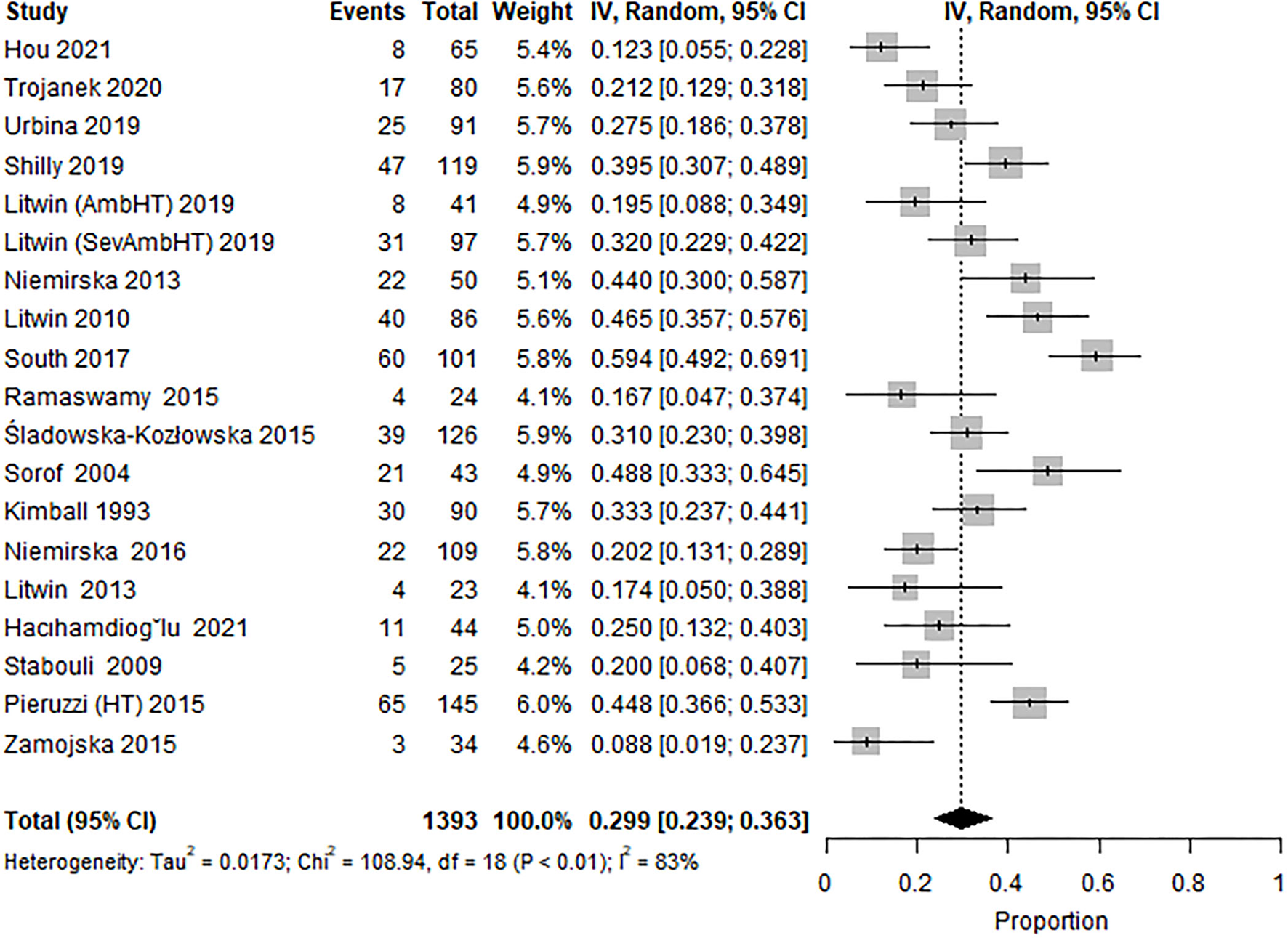 Forest plot showing the prevalence of LVH in the subset of studies from specialty clinics, LVH defined by ultrasound estimated LVMI ≥95th percentile and excluding subjects with WCH and/or preHT (18 studies, 19 study cohorts).