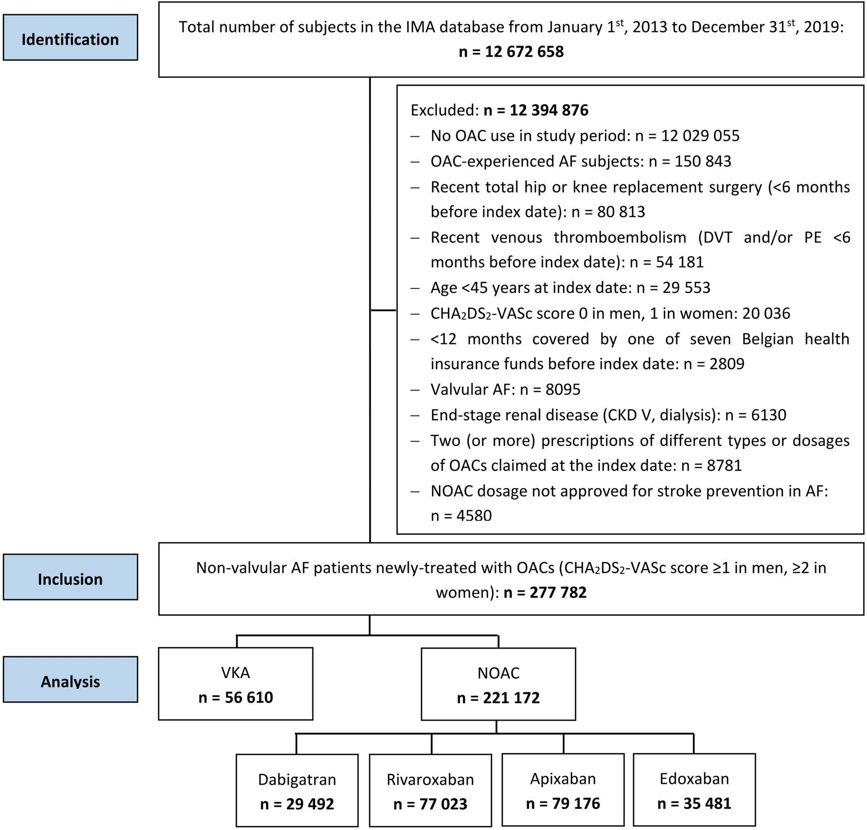 Subjects ≥ 45 years old with ≥ 1 year coverage by a Belgian health insurance fund were included from the IMA database on the first date of filling an OAC prescription (= index date) during the study period from January 1st, 2013 to December 31st, 2019 (Supplementary Figure 1). NOAC (dabigatran, rivaroxaban, apixaban, and edoxaban) and VKA users (warfarin, acenocoumarol, and phenprocoumon) were included. Only OAC-naïve AF patients indicated for chronic anticoagulation were considered, excluding OAC-experienced subjects with an OAC prescription filled ≤ 1 year before the index date and subjects at low thromboembolic risk (CHA2DS2-VASc score 0 in men, 1 in women) on the index date (7, 12, 18, 24).
