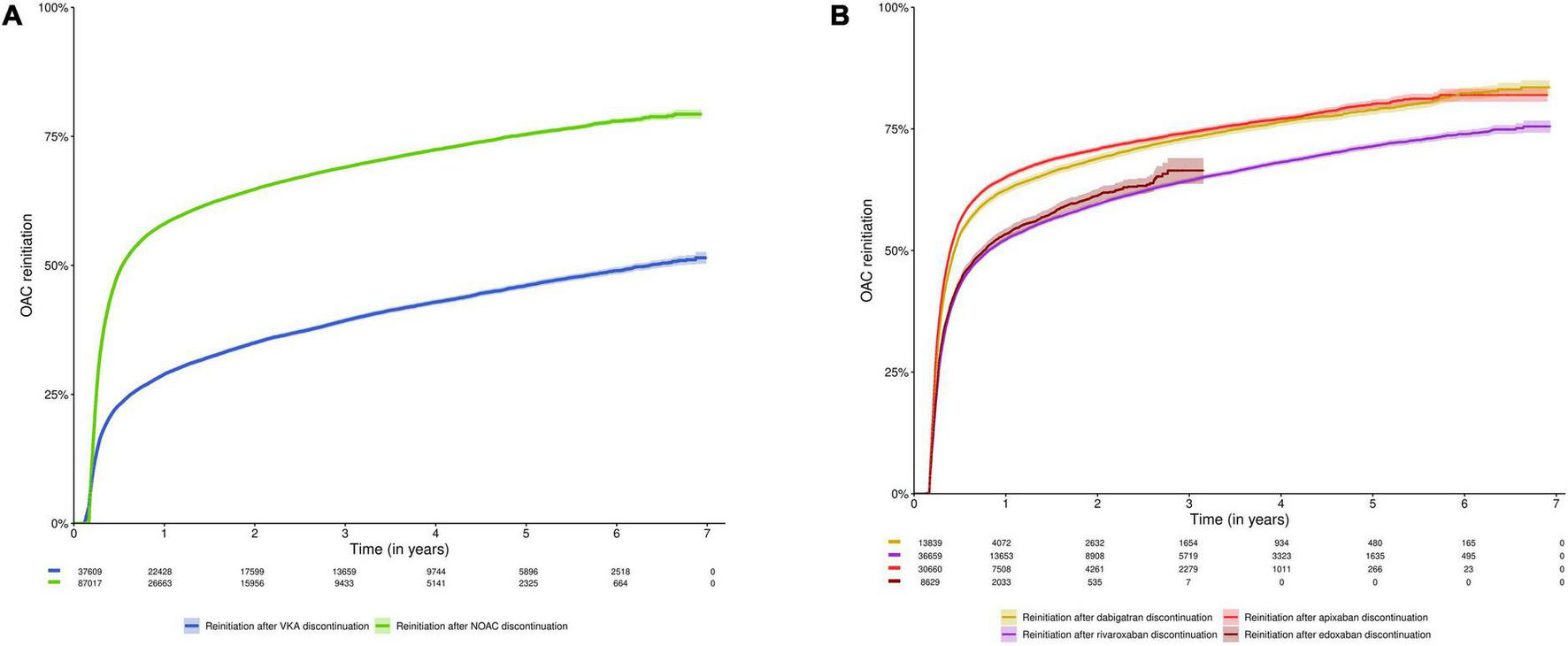 Among subjects having discontinued treatment, the time from discontinuation to reinitiation of anticoagulation was investigated. The date of reinitiation was defined as the first OAC dispensing date after discontinuation.