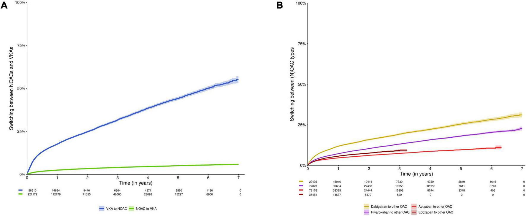 Switching was defined as the dispensing of another OAC before or within 60 days after the last day of supply of the index OAC, considering the dispensing date of the new OAC as the switch date. The direction of switching (VKAs to NOACs or vice versa; specific NOAC type to any other OAC; and standard to reduced dose NOACs or vice versa) was assessed.