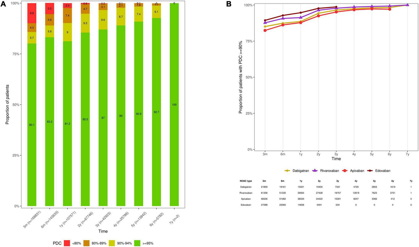 Lastly, adherence was investigated using the proportion of days covered (PDC) in patients persistent on NOAC treatment after a specific time interval (e.g., 1 year) (to avoid confusing non-adherence with non-persistence), in line with the taxonomy of the European ABC (Ascertaining Barriers to Compliance) Group (32, 33) and prior research (8, 34). Due to variable dosing regimens and lack of INR values, adherence to VKAs was not assessed. The PDC was calculated as the number of days covered with NOAC supply during a time interval, divided by the total number of days of that time interval (PDC range 0–100%). In order to specifically investigate patient-related NOAC adherence at home, only ambulatory prescription claims were considered, consistent with previous studies (7, 10, 12). In case of hospitalization, the length of inpatient stay was deducted from the number of days in the studied time interval (7, 10, 12). A PDC of < 90% was defined as non-adherence, as higher thromboembolic and mortality risks have been observed in OAC-treated patients with an adherence below 90% (7, 8, 34).