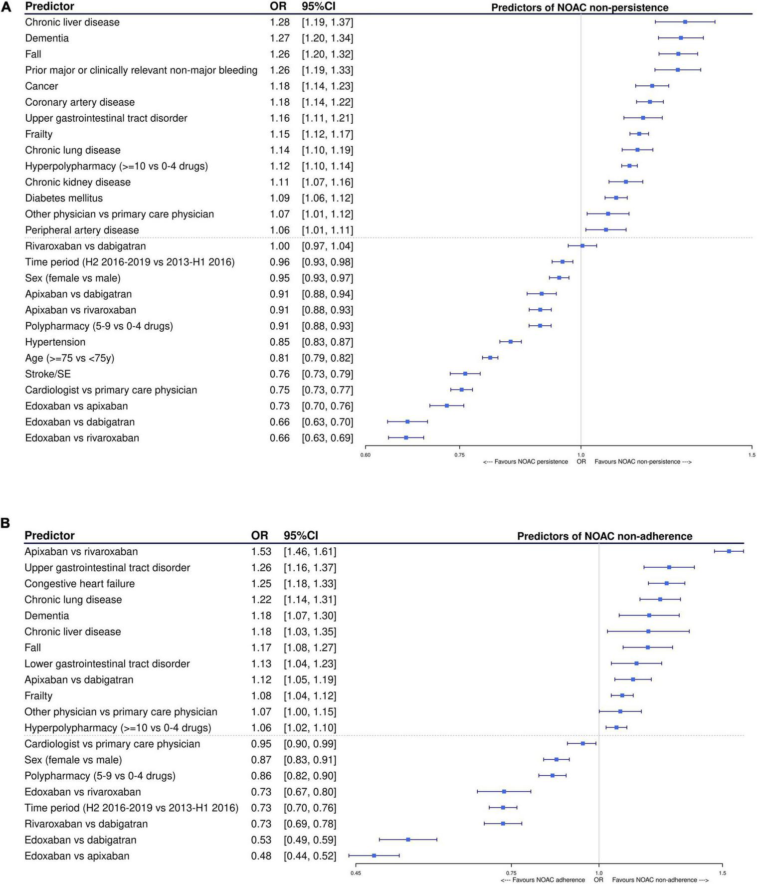 Predictors for non-persistence (versus persistence) and non-adherence (PDC < 90% versus ≥ 90%) among incident NOAC users after 1 year were explored using multivariable logistic regression in the subgroup of subjects with ≥ 1 year of follow-up. NOAC type (with dabigatran, the first approved NOAC, as reference), age (≥ 75 versus < 75 years), sex, cardiovascular comorbidities, geriatric traits (e.g., frailty), thromboembolism-and/or bleeding-related comorbidities (e.g., cancer), (hyper)polypharmacy, prescriber type and time period (dichotomized as July 2016-December 2019 versus January 2013-June 2016) were fitted in a multivariable model with backward elimination. Only statistically significant factors using a two-sided p-value of < 0.05 were retained in the final model. Odds ratios (OR) with 95% confidence intervals (CIs) were calculated and visualized in forest plots. Additionally, adjusted ORs for non-persistence and non-adherence when comparing other NOAC types were also calculated and visualized after adjusting for the same factors of the final model. Lastly, due to the transition from ICD-9 to ICD-10 in 2015, and incomplete data transfer in 2019, some ICD-coded hospital discharge diagnoses were missing at the time of data delivery (7.9% of the cohort). These missing data were accounted for through multiple imputations by chained equations. All analyses were performed in R (R version 3.6.0).