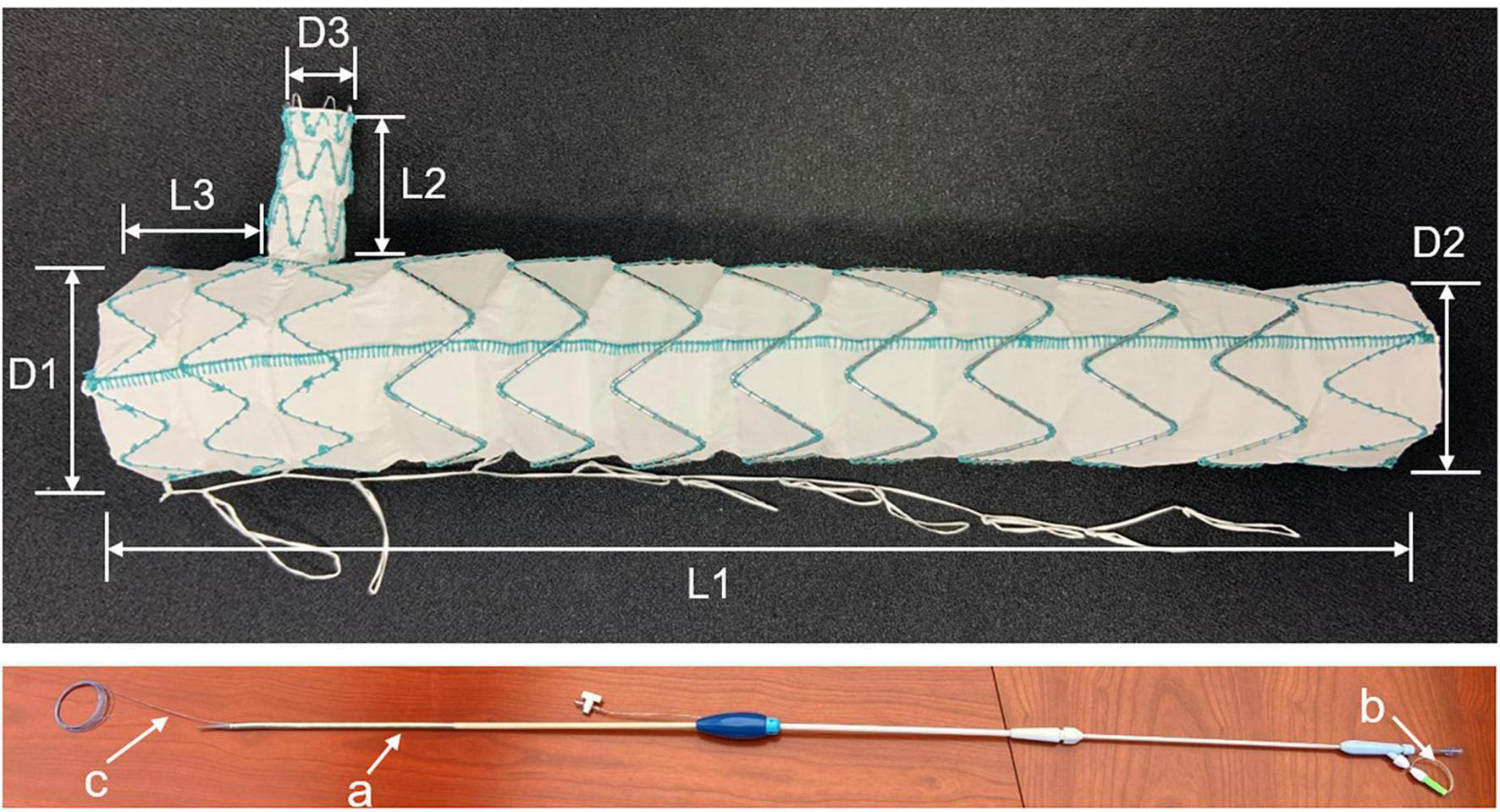 Castor single-branched stent graft and the delivery system. a, 24-Fr outer sheath; b, trigger wire; c, traction wire.