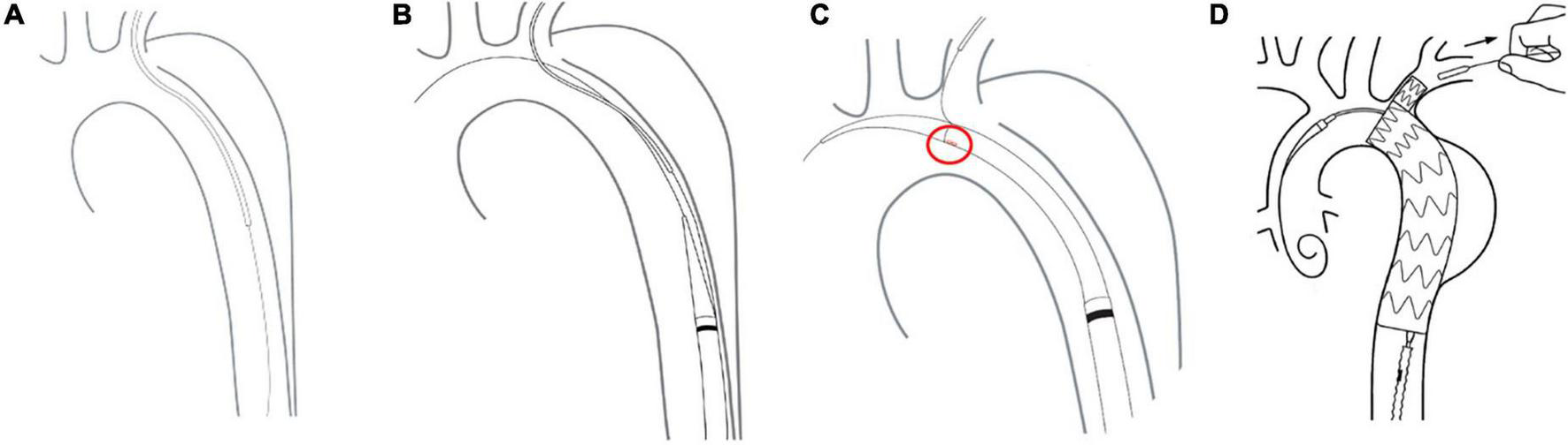 Delivery and deployment of a Castor single-branched stent graft. (A) The guidewire is advanced from the femoral artery to the left brachial artery. (B) The delivery system is inserted into the descending aorta. (C) The correct position of the branch is assessed by the alignment of a marker band. (D) Stent deployment.