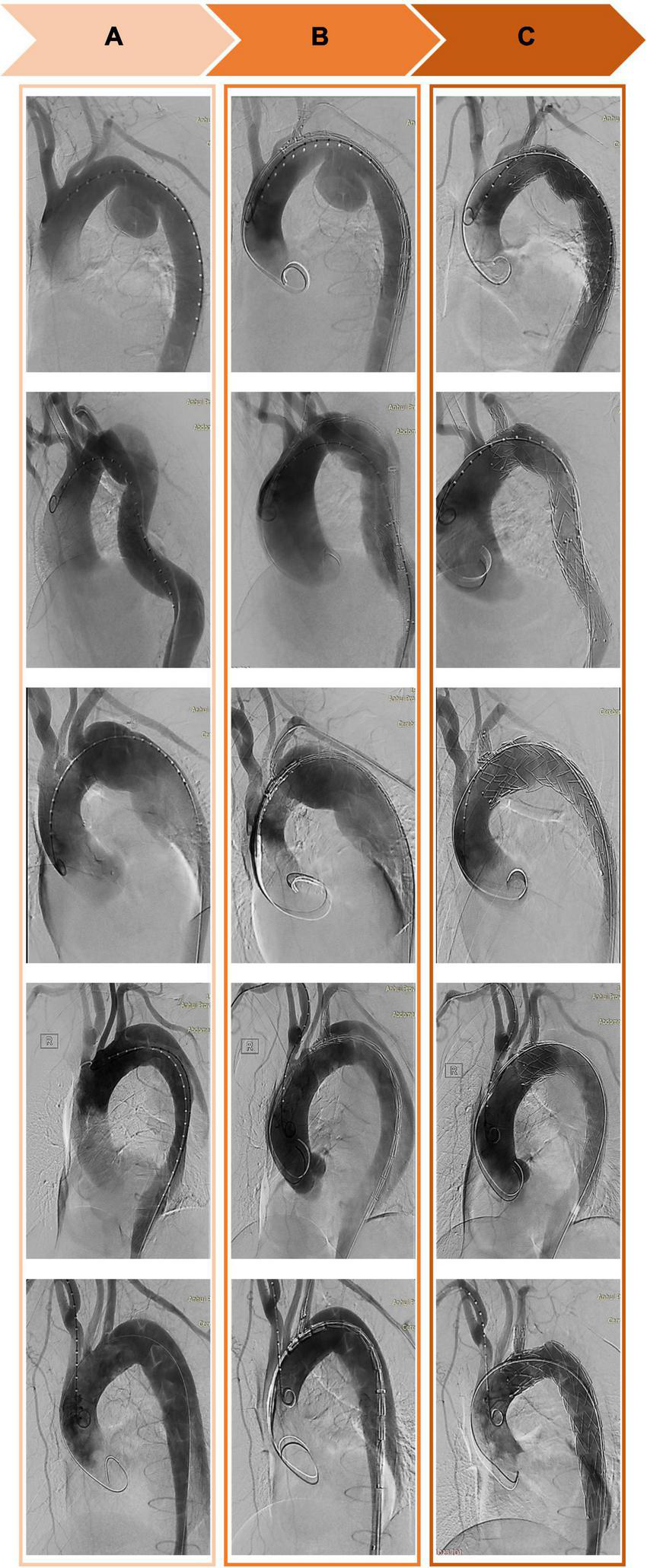 The inclusion criteria were (1) men and non-pregnant women aged 18–80 years; (2) diagnosis of distal aortic arch disease, including aortic dissection (AD), penetrating aortic ulcer (PAU), thoracic aortic aneurysm (TAA) with a diameter of >5.5 cm, and rapid aortic growth (>1 cm/year); (3) distance between the proximal end of the aortic lesion and the LSA ostium <15 mm; (4) aortic disease not affecting the left common carotid artery (LCCA), and distance between the proximal end of the aortic lesion and the LCCA ostium >15 mm; (5) distance from the origin of the left vertebral artery (LVA) to the LSA ostium >25 mm; (6) distance between the LCCA ostium and the LSA ostium >5 mm; and (7) aortic arch diameter <40 mm.