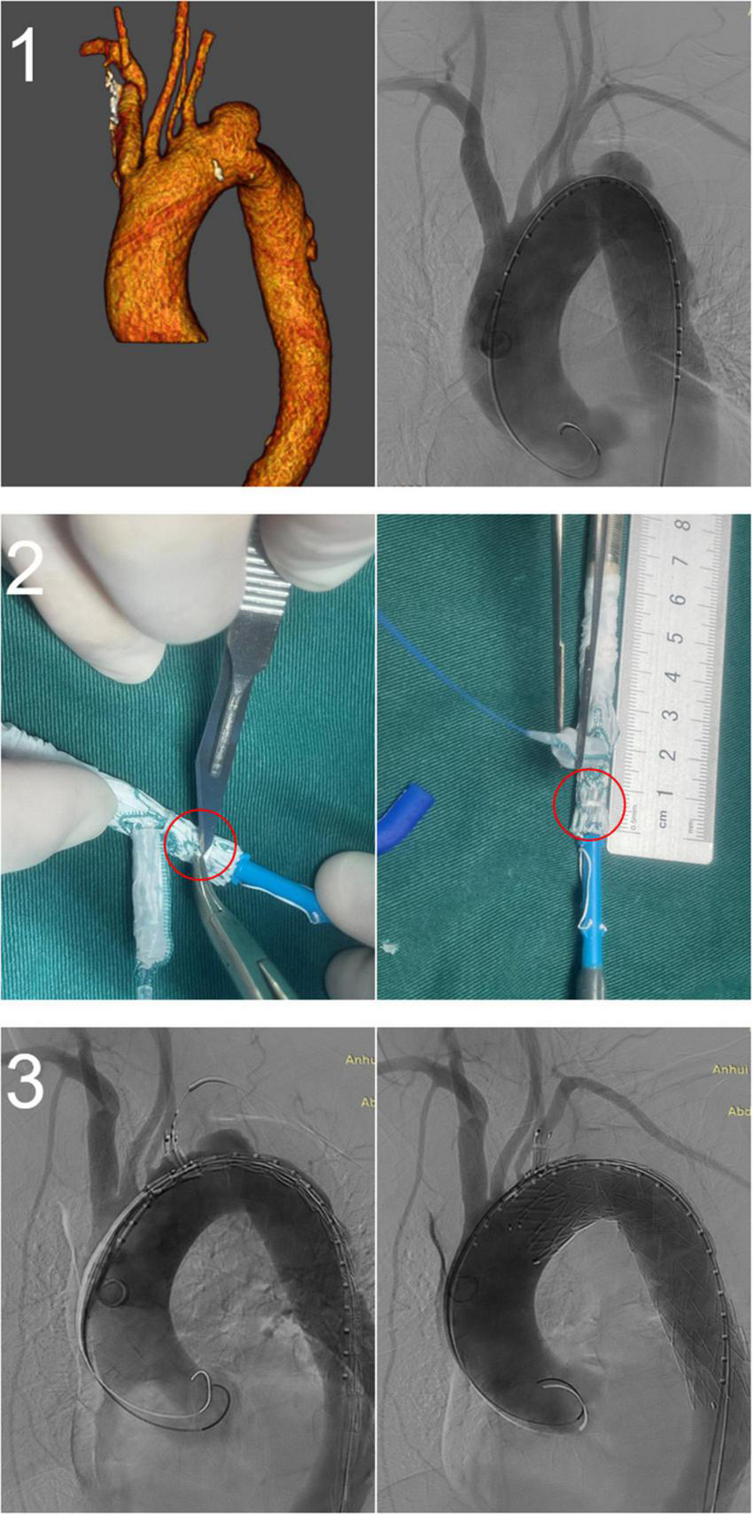 A fenestrated-branched stent graft was used to reconstruct the left subclavian artery (LSA) and the left vertebral artery (LVA). (1) Preoperative computed tomography angiography showing that the LVA originated from the aortic arch. (2) In vitro fenestration of the Castor stent graft. (3) Intraoperative and postoperative angiography showing the successful reconstruction of the LSA and LVA.