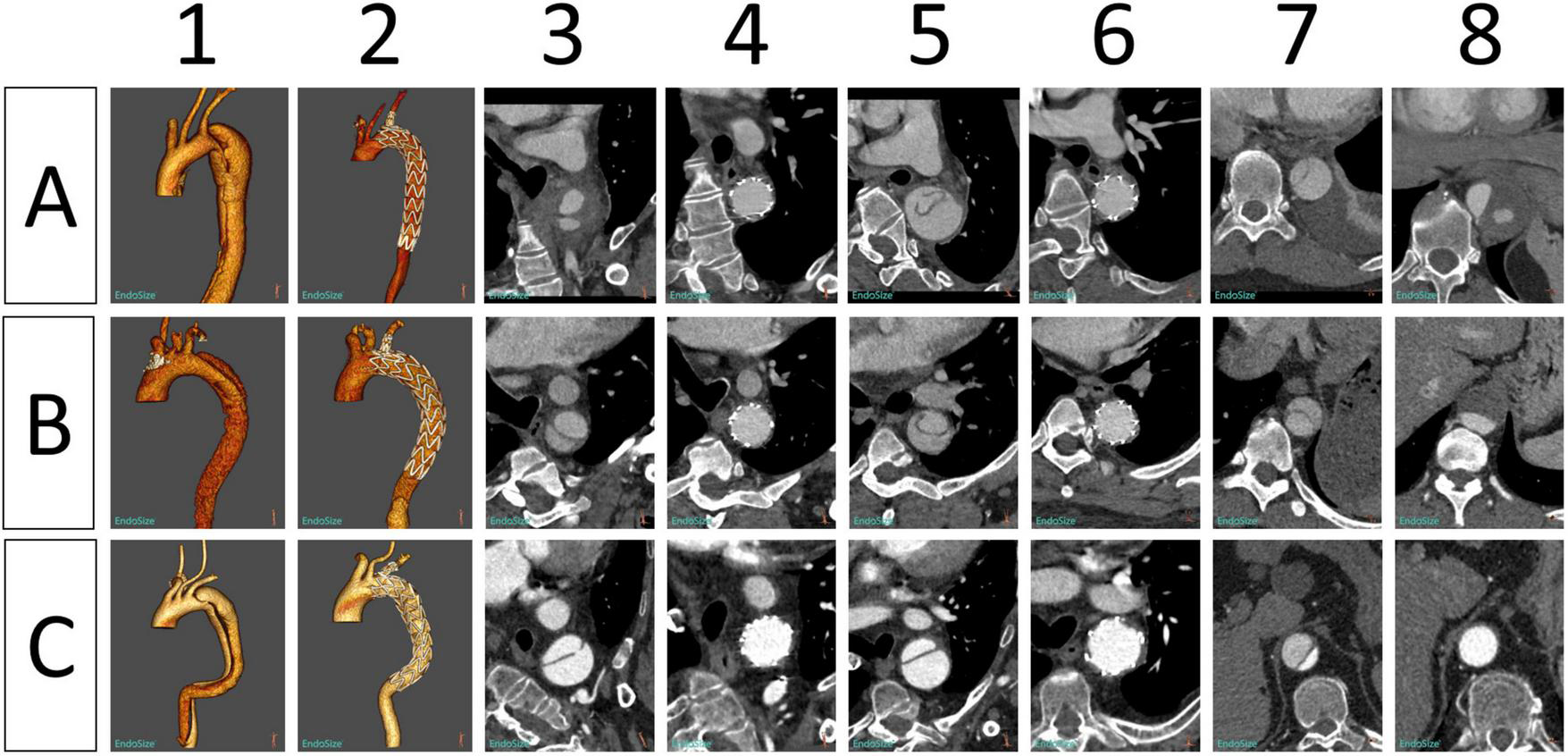 All patients underwent high-resolution computed tomography angiography (CTA) of the aorta before operation. CTA data were measured and reconstructed using an Endosize vascular imaging workstation (Endosize; Therenva Inc., Rennes, France). The centerline along the aorta was set up during 3D reconstruction to improve the accuracy of measurements, except in cases in which the length of the aortic arch and the distance between aortic branches were measured along the greater curvature.