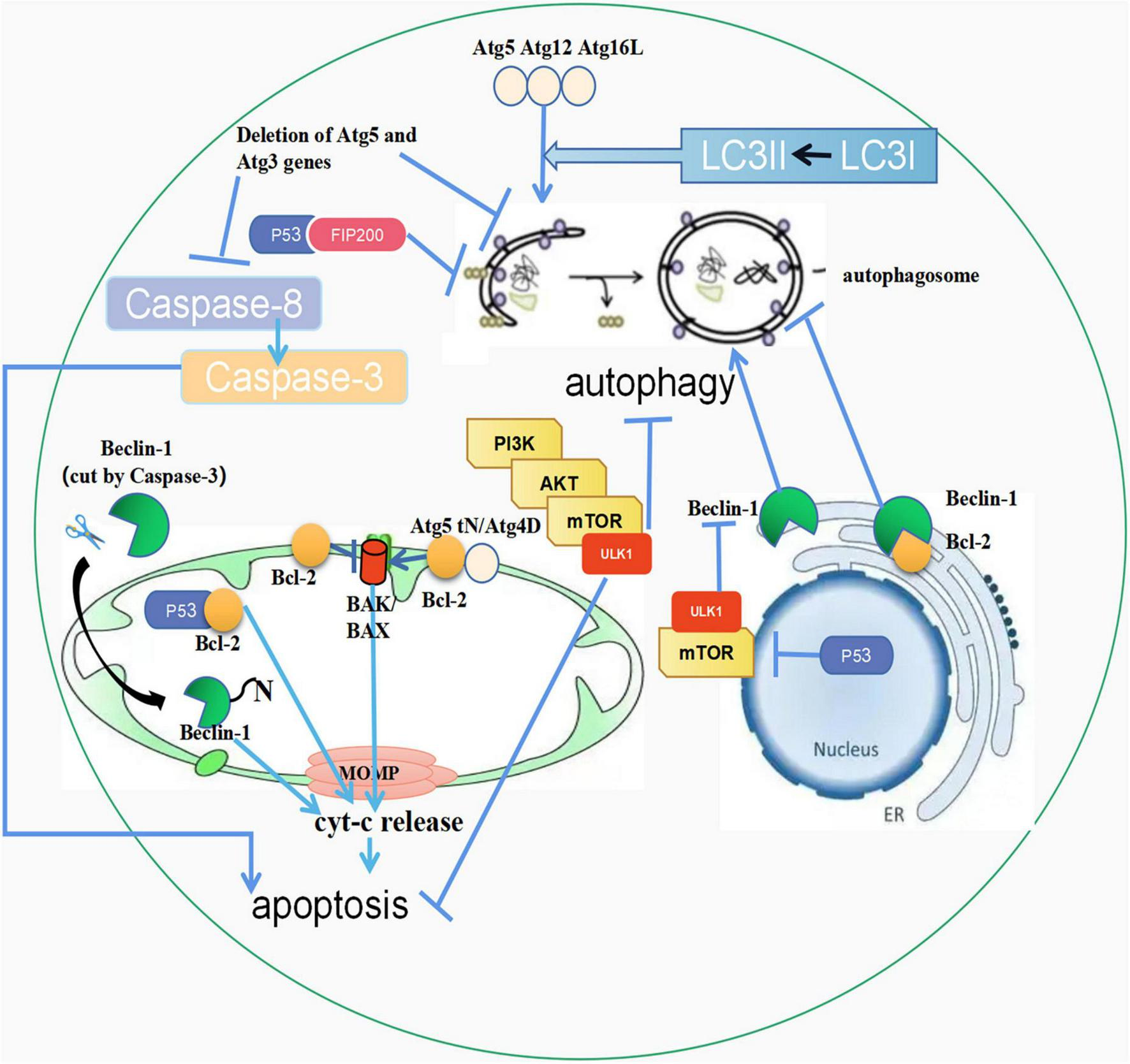 The crosstalk between autophagy and apoptosis. (1) Atg5, Atg12, and Atg16L combine to form a complex, activating LC3-I to LC3-II. Then LC3-II fuses with the autophagic outer membrane to promote the development of autophagy. In addition, the unconjugated Atg5 is cleaved by calpain, and its product, Atg5tN, naturally enters the mitochondria. Subsequently, in the mitochondria, Atg5tN mediates the release of Cyt-c by interacting with BCL-2 proteins, thereby promoting apoptosis. Full-length Atg4D promotes apoptosis, and ΔN63 Atg4D gains GABARAP-L1 coupling autophagy with apoptosis; (2) The PI3K/AKT/mTOR pathway can inhibit both autophagy and apoptosis; (3) Beclin-1 in the endoplasmic reticulum can promote the occurrence of autophagy, but when combined with Bcl-2, it can inhibit autophagy. The cleaved Beclin-1 by Caspase-3 can be translocated to mitochondria, triggering apoptosis; (4) p53 in mitochondria can combine with Bcl-2 to promote apoptosis. p53 in the nucleus promotes autophagy through the mTOR pathway, and p53 in the cytoplasm inhibits autophagy by interacting with FIP200. (5) Deletion of ATG5 and ATG3 inhibits autophagy and apoptosis, and caspase-3 cleaves Beclin-1 to promote apoptosis. ↑ induce; ⟂ inhibit.