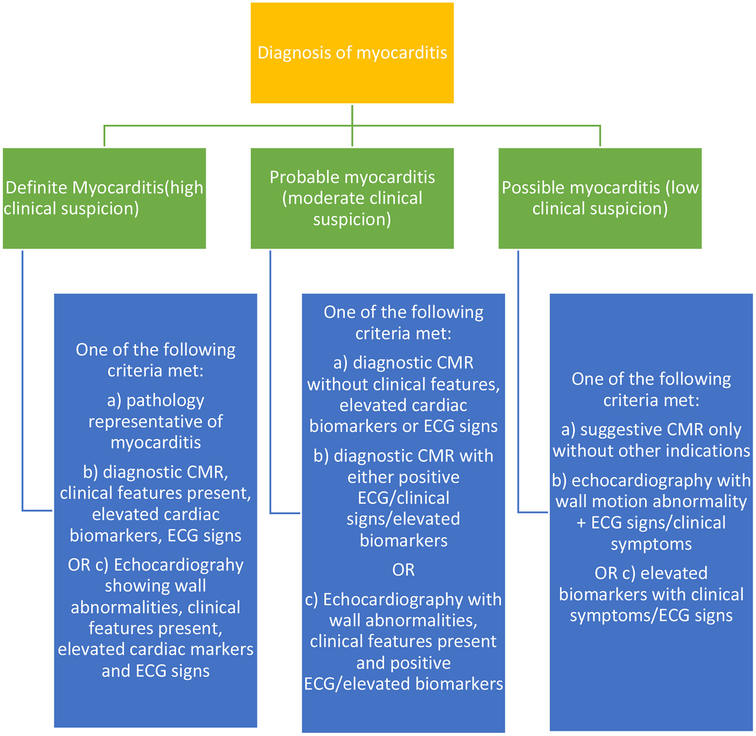 In total, screening tests should be a necessity for patients undergoing ICI therapy, and these tests if decided to be conducted at regular intervals, should all be non-invasive. The EMB and other complementary tests which may be invasive should be pursued when there is a high suspicion of significant risk in patients in cases of myocarditis, etc based on other baseline tests. The following Figure 2 shows the categorical diagnostic criteria for myocarditis as described by many accredited journals.