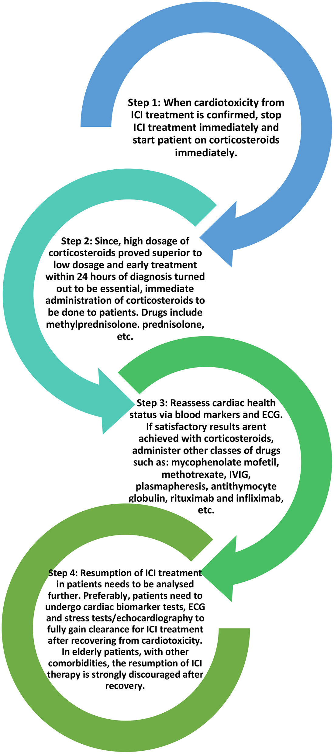 The success rate for treating ICI-induced cardiotoxicities lies in the timely diagnosis and appropriate treatment administration to patients. Various researchers have tried a multitude of ways to enhance the treatment plans for cardiotoxicities amidst ICI therapy. A consensus has been reached by most healthcare authorities about a suitable treatment plan, but no strict conformed treatment regimen has been laid out because the treatments are rather subjective to each patient. The treatment plan is customized to each patient and takes into account various factors such as the severity of the disease, comorbidities and pre-existing medical conditions in the patient, age, the possibility of relapse, etc (51).