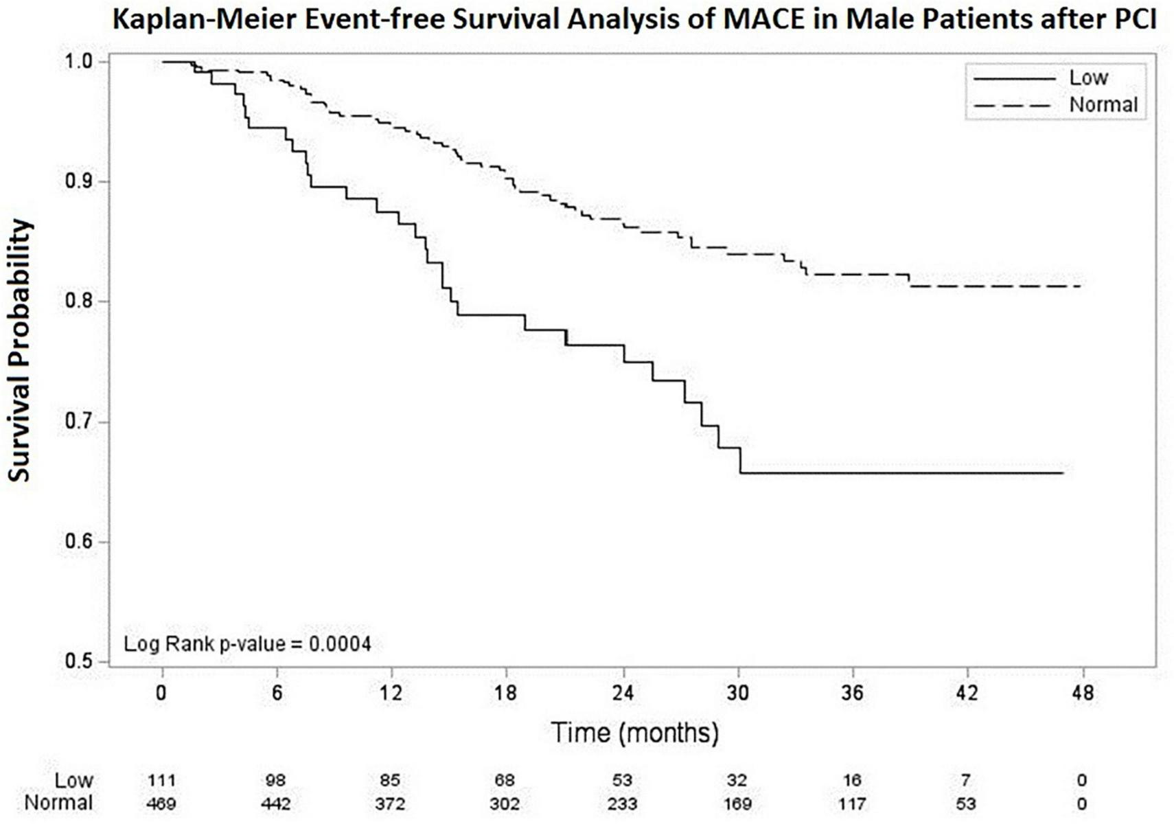 Between 2015 and 2018, 580 men undergoing PCI at a tertiary referral hospital were divided into low (<3.25 ng/mL) and normal (≥3.25 ng/mL) testosterone groups. Major adverse cardiovascular event (MACE) was defined as the composite outcome of CV death, myocardial infarction, and target lesion revascularization/target vessel revascularization (TLR/TVR) during up to 48 months follow-up after PCI.