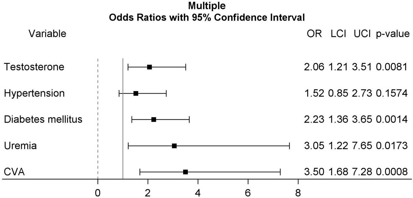 Forest plots for multiple logistic regression including testosterone (≥3.25 ng/mL, as reference group), hypertension, diabetes mellitus, uremia, and CVA. CVA, cerebrovascular accident.