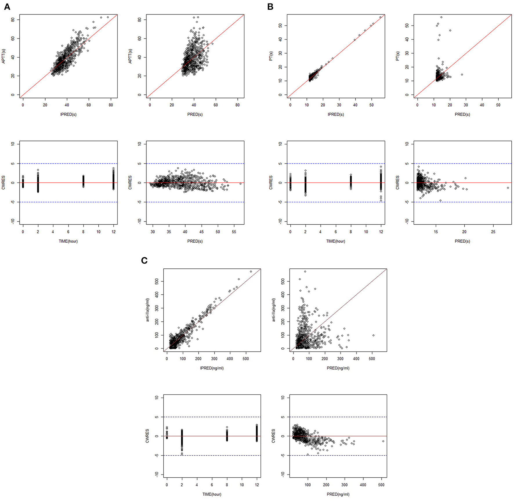 We first developed the PopPK model based on the data from the healthy volunteers and then modeled the APTT, PT, and anti-FIIa activity time curves of dabigatran in healthy volunteers using the Bayesian estimation pharmacokinetic parameters of each individual (22, 23). Using this PK/PD model, we conducted external verification based on patient PK data to confirm the feasibility of extrapolating data from volunteers to patients. Finally, we included the patient PD data in the original model to develop a comprehensive PK/PD model.