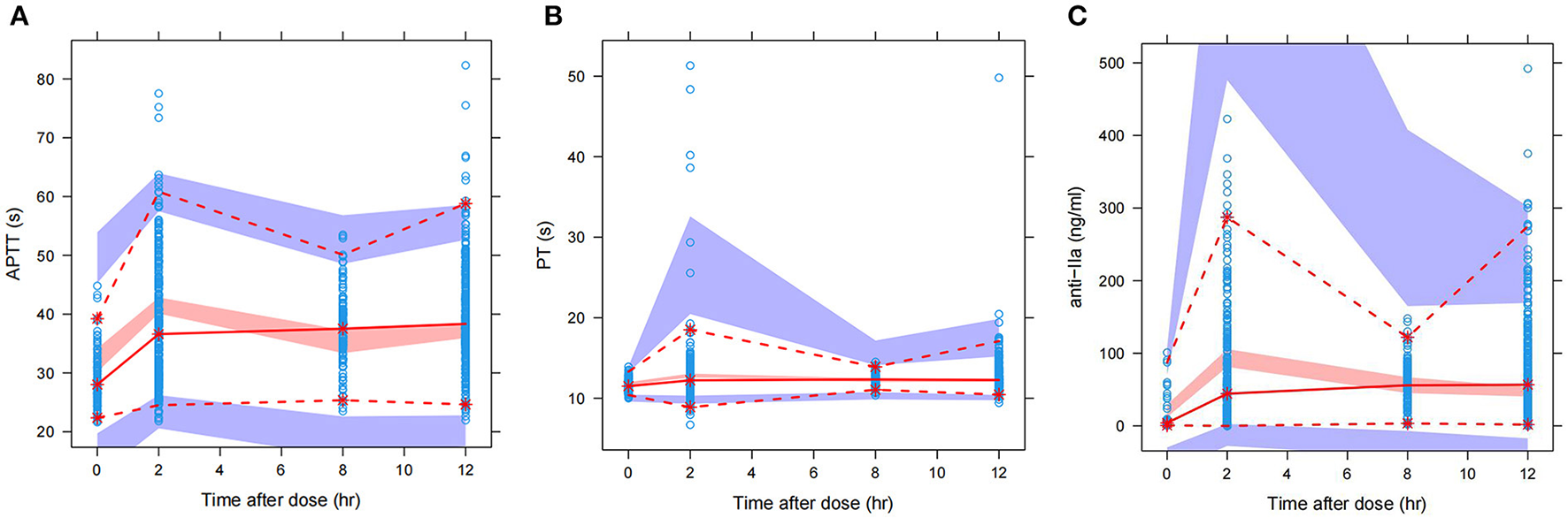 For the above purposes, previous studies have focused on population PK (PopPK) analysis in AF patients (14–16). Although these studies involved PK modeling and simulation, they did not include healthy Chinese volunteers. Besides, AF patients were mainly from the premarket studies (such as the RE-LY or PETRO studies) by sponsors (6, 17), not from real-world studies. Moreover, only one study contained the PD index of APTT (15), and none focused on the bleeding events. Therefore, the purpose of our study was first to establish a PopPK model and PK/PD model based on the PK and PD data of healthy Chinese volunteers; second, to verify the extrapolation applicability of the volunteer model based on the sparse PK data of patients; and finally, to establish a comprehensive PK/PD model based on the PD data of volunteers and patients. In addition, we discussed the correlation between the comprehensive PK/PD model and cumulative clinical bleeding events and evaluated the influence of selected factors. Finally, in a virtual population of patients with NVAF, we used our model to simulate PD indicators and compared the obtained ranges with the relevant guidelines.