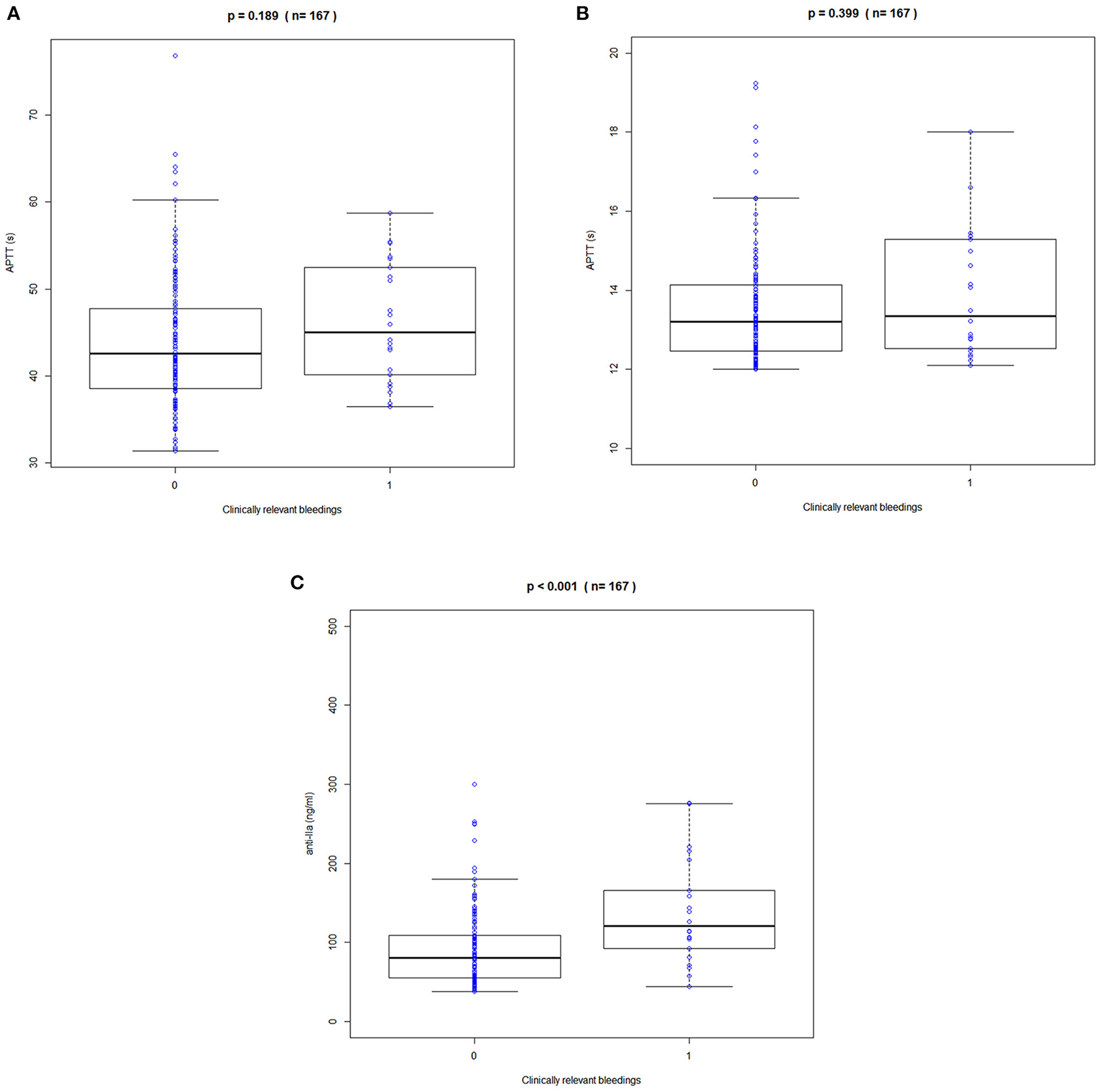 Supplementary Figure 4-2Probability plot for clinically relevant bleeding and APTT, PT, and anti-FIIa trough values. (A) APTT. (B) PT. (C) anti-FIIa.