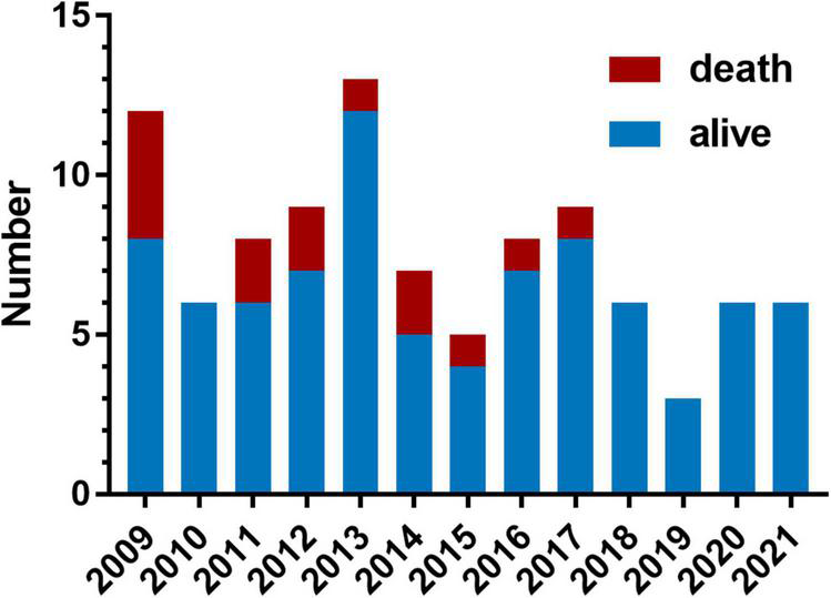 Variation across years in the number of patients who underwent truncus arteriosus (TA) repair and the early mortality. Each bar contains the number of patients who suffered operative mortality (red portion) and the number of patients who survived (blue portion).