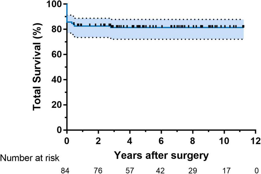 The distribution of surgery numbers by era depicted in Figure 1 shows that surgical repairs before 2015 were associated with relatively increased early mortality compared with operations performed in later eras (20% vs. 7.0%, P < 0.05). Median ICU stay was 9 (7.3, 13.8) days in the group with PHC and 7 (6, 7) days in the group without PHC, respectively. There was no significant difference between patients with or without PHC in early outcomes except for numbers of patients subjected to significant TR post-operatively (P = 0.009) (Table 3). Both of the bilateral PA sizes decreased apparently compared with the pre-operative diameter of branch PAs (P < 0.05). Early mortality was 14.2% (n = 14). Late death occurred in four patients. Total survival at 1 and 10 years was 82.6% and 81.4% in patients within follow-ups (Figure 2). Low cardiac output, multiple organ failure, and malignant arrhythmia were responsible for the early death of the remaining cases of death. Multivariable analysis revealed the relationship between early mortality and longer CPB time (OR 1.0, 95% CI: 1.0, 1.0, P = 0.01) (Table 4). Notably, many risk factors, previously deemed to be related to mortality such as low body weight, CAA, interrupted aortic arch (IAA), pre-operative LVEF, significant TVI, and PHC did not reach statistical significance in this study.