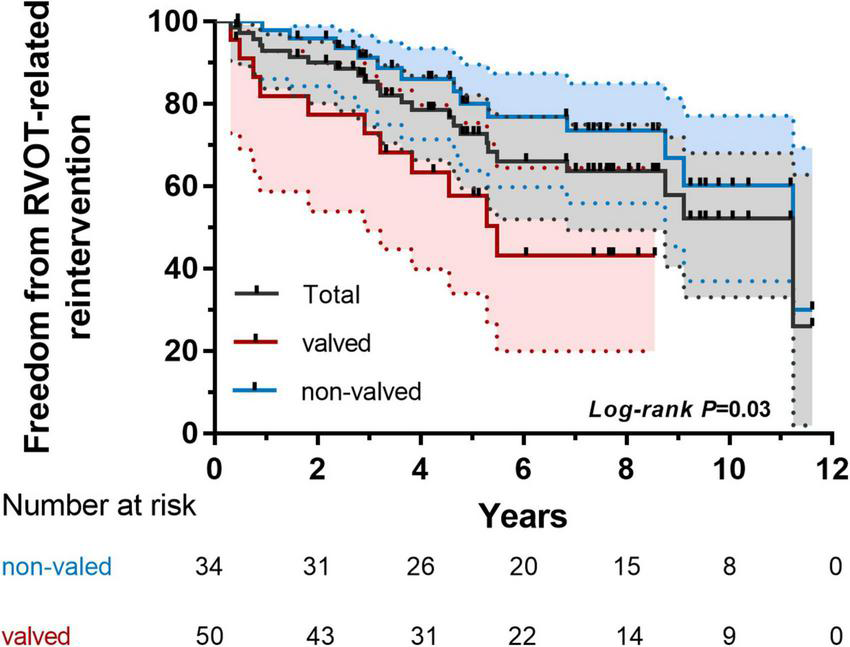Kaplan–Meier analysis of freedom from right ventricular outflow tract (RVOT)-related reintervention of subgroups (valved and non-valved).