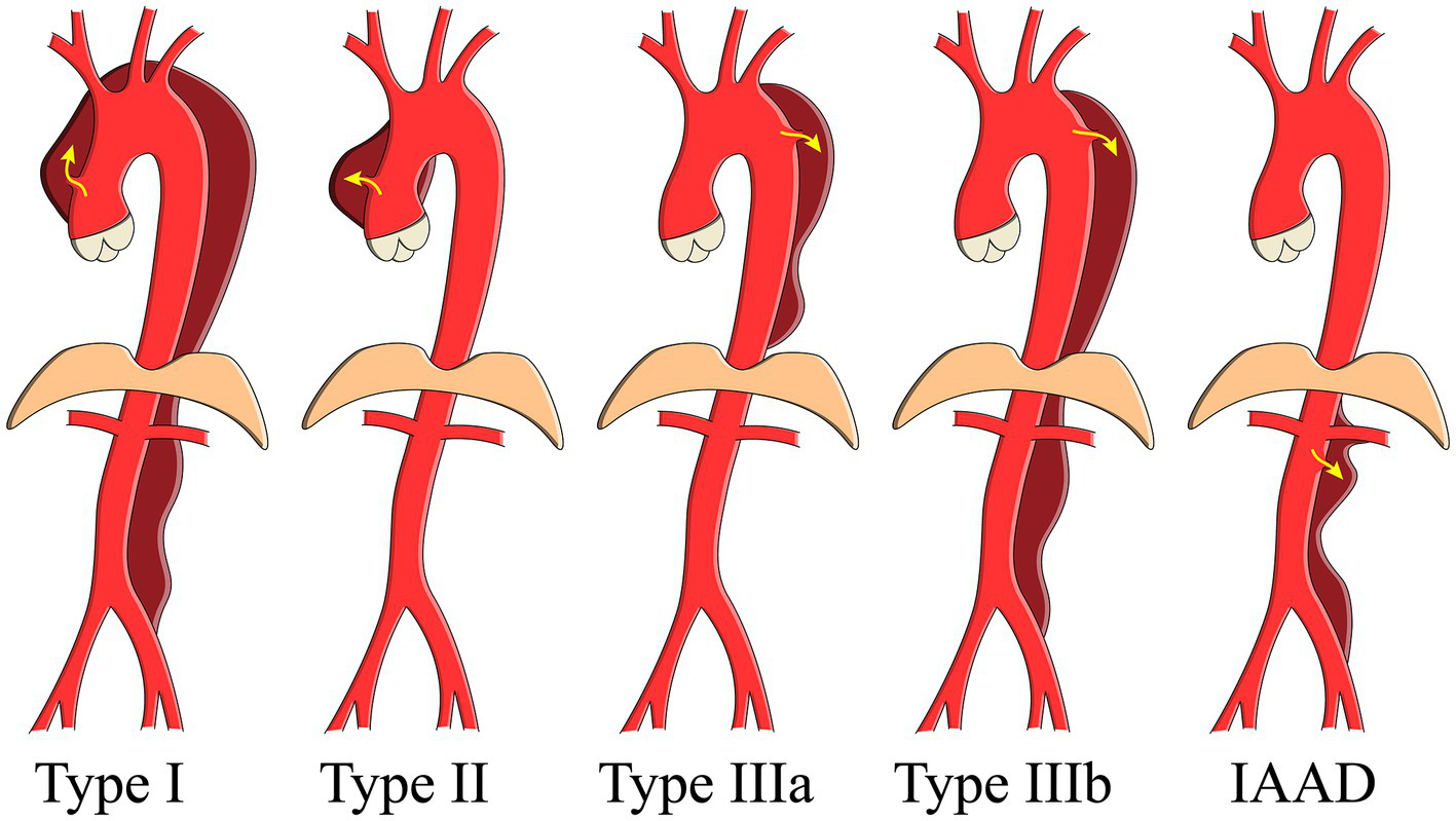 Schema showing the aortic dissection classification. IAAD, isolated abdominal aortic dissection.