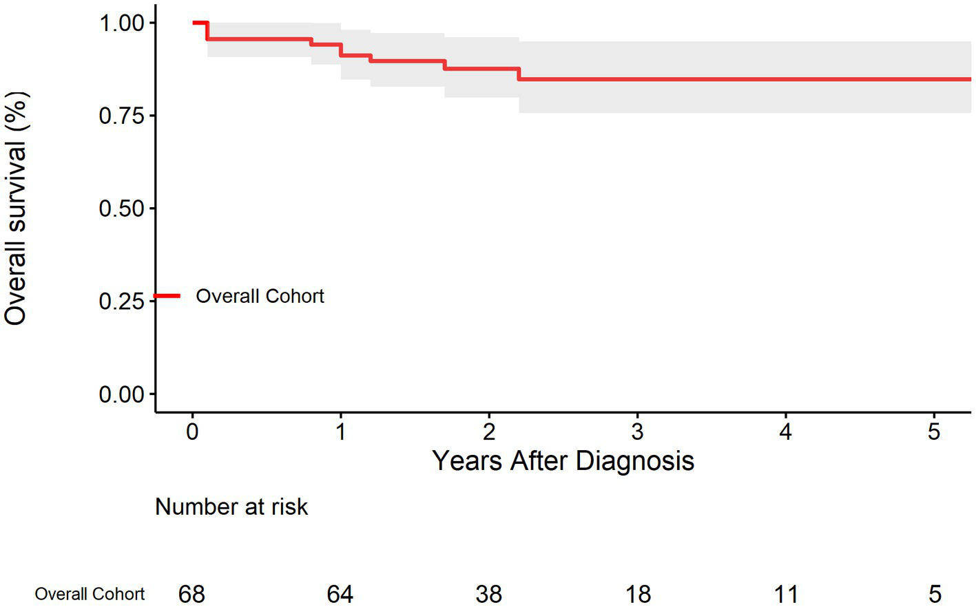 Kaplan–Meier survival curve by treatment for the overall cohort.