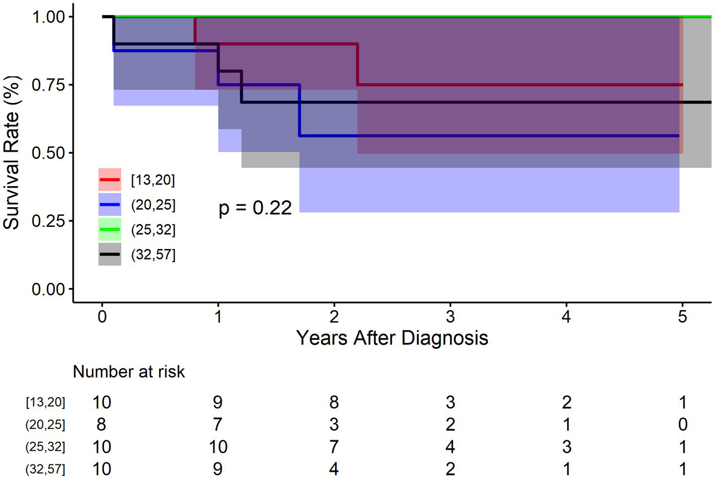 The BMT cohort was divided into four groups according to the quartiles of diameter: Q1: 13–20 mm (n = 10), Q2: 21–25 mm (n = 8), 26–32 mm (n = 10), 33–57 mm (n = 10). Figure 4 shows that there was no significant difference between IAAD of different sizes regarding mortality (p = 0.220). The survival rate at 1, 3, and 5 years of follow up were 90.0% (95% CI: 73.2–100.0%), 75.0% (95% CI: 49.6–100.0%), and 75.0% (95% CI: 49.6–100.0%) respectively for Q1 of aortic size, and 75.0% (95% CI: 50.3–100.0%), 56.2% (95% CI: 28.1–100.0%), and 56.2% (95% CI: 28.1–100.0%) respectively for Q2 of aortic size, and 100.0% (95% CI: 100.0–100.0%), 100.0% (95% CI: 100.0–100.0%), and 100.0% (95% CI: 100.0–100.0%) respectively for Q3 of aortic size, and 80.0% (95% CI: 58.7–100.0%), 68.6% (95% CI: 44.5–100.0%), and 68.6% (95% CI: 44.5–100.0%) respectively for Q4 of aortic size. Compared to Q1 of aortic size, the HR of mortality for Q2 and Q4 were 2.2 (95% CI: 0.3–13.6, p = 0.372), and 1.7 (95% CI: 0.2–10.7, p = 0.526), respectively. The HR for Q3 was not applicable because no events were observed in this sub-cohort.