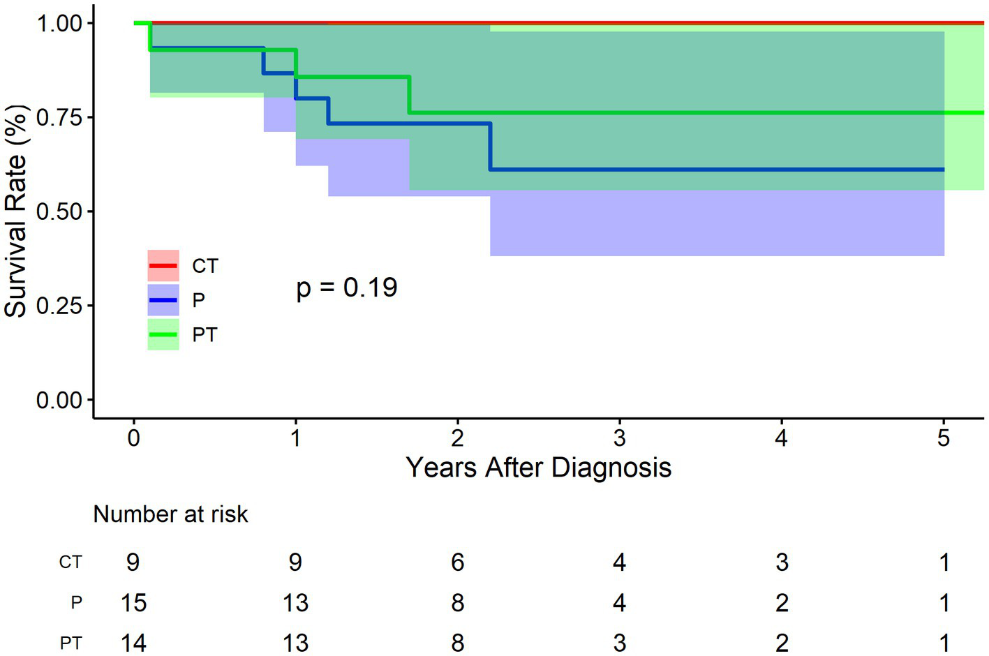As regards false lumen status, there were 9 cases of CT, 15 cases of P, and 14 cases of PT in the BMT cohort. Figure 5 shows that CT group fared improved survival rate, followed by group PT and P, respectively, although not significantly (p = 0.190). The survival rate at 1, 3, and 5 years of follow up were 100.0% (95% CI: 100.0–100.0%), 100.0% (95% CI: 100.0–100.0%), and 100.0% (95% CI: 100.0–100.0%) respectively for CT group, and 80.0% (95% CI: 62.1–100.0%), 61.1% (95% CI: 38.2–97.8%), and 61.1% (95% CI: 38.2–97.8%) respectively for P group, and 85.7% (95% CI: 69.2–100.0%), 76.2% (95% CI: 55.6–100.0%), and 76.2% (95% CI: 55.6–100.0%) respectively for PT group. Compared to group P, the HR of mortality for group PT was 0.6 (95% CI: 0.1–2.5, p = 0.487). The HR for group CT was not applicable because no events were observed in this sub-cohort.
