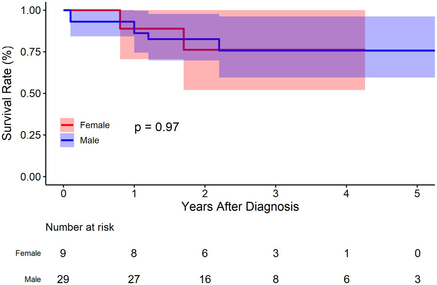 There were 29 males and 9 females in the BMT cohort. As was demonstrated in Figure 6, no significant deference was observed between male and female concerning survival rate (p = 0.970). The survival rate at 1, 3, and 5 years of follow up were 86.2% (95% CI: 74.5–99.7%), 75.7% (95% CI: 59.6–96.2%), and 75.7% (95% CI: 59.6–96.2%), respectively for male, and 88.9% (95% CI: 70.6–100.0%), 76.2% (95% CI: 52.1–100.0%), and 76.2% (95% CI: 52.1–100.0%) respectively for female. Compared to female, the HR of mortality for male was 1.0 (95% CI: 0.2–5.1, p = 0.963).