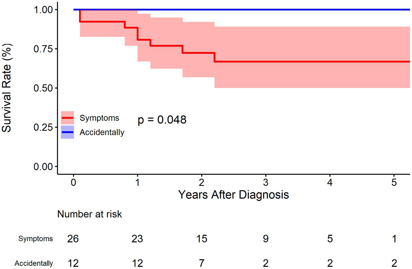 Kaplan–Meier survival curve by symptoms for the conservatively treated cohort.
